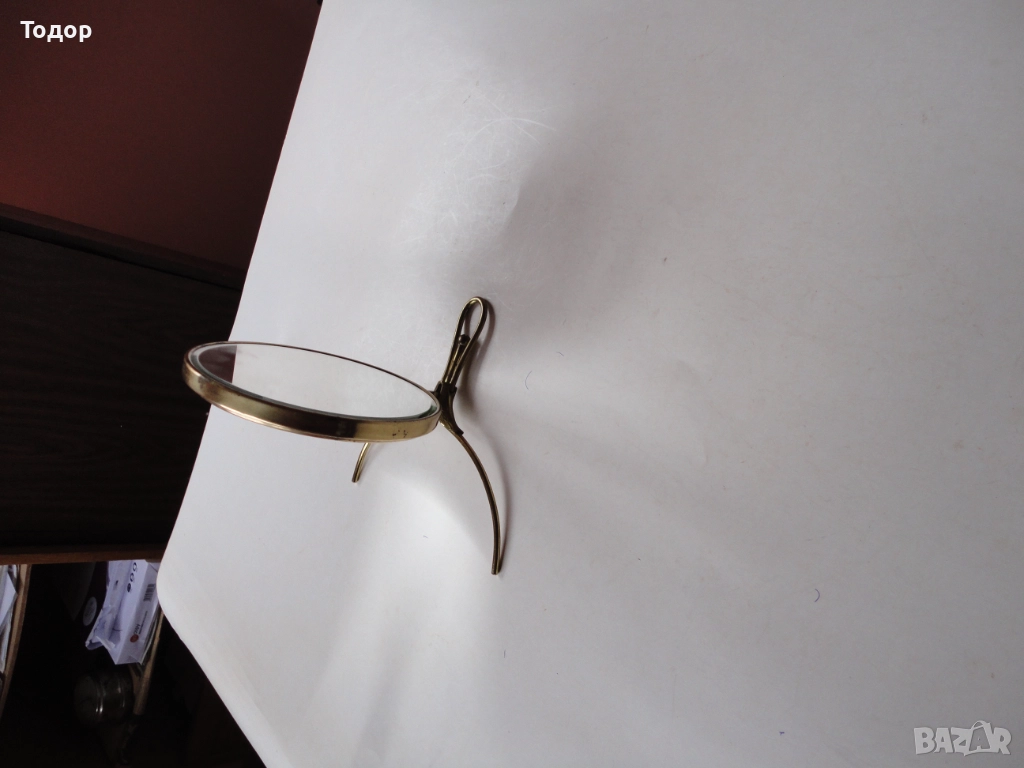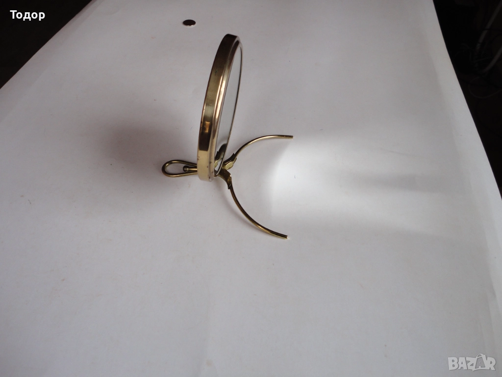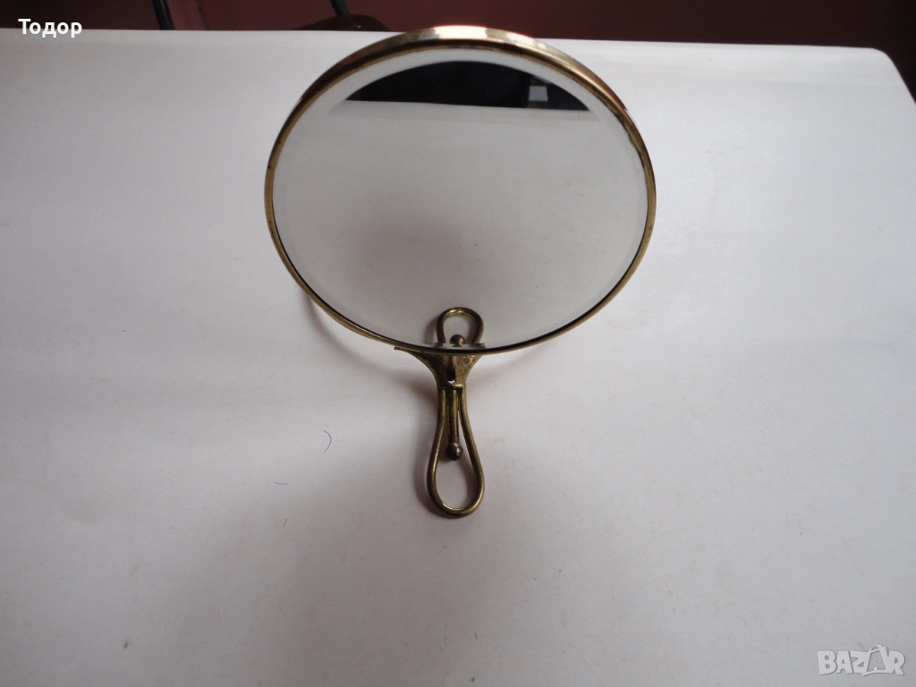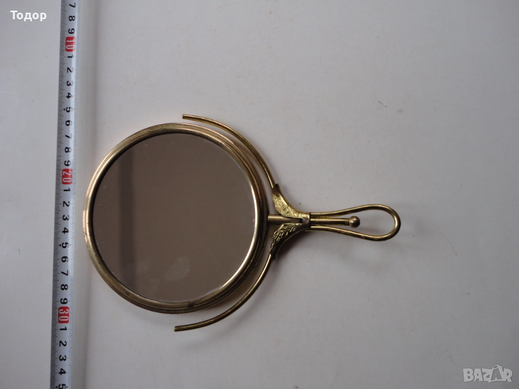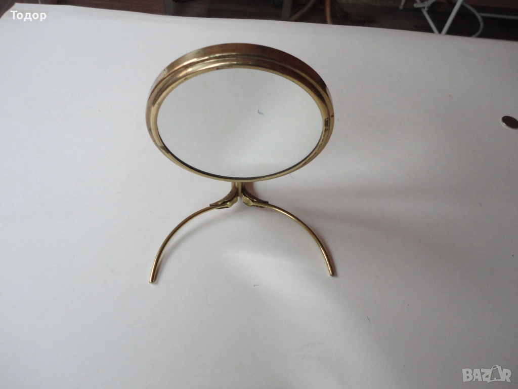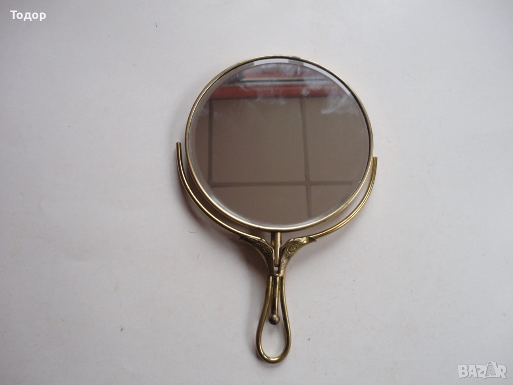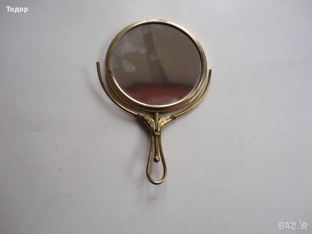 Страхотна изработка от плътен бронз Двустранно като от едната страна е увеличително Диаметър 13,5 см Височина с дръжка 22 см Двете съкла на огледалото са в перфектно състояние Много майсторска изработка която позволява огледалото да се ползва като настолно и като ръчно и може да се движи в различни посоки Отлично състояние
