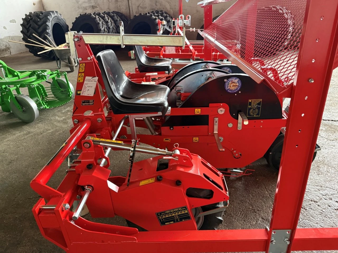 Разсадо-Посадъчна Машина Checchi&Magli модел Wolf Pro ХАРАКТЕРИСТИКА: ПРОИЗХОД: Италия Междуредово разстояние: минимум 30 см Може да се използва за засяване на конусовидни, кубични и пирамидални форми, също така може да сее и семена Подходяща е за работа при засяване със или без мулчиращо фолио Изсяващите апарати са независими един от друг и са модулни, така машината може да работи както с един, така и два реда Изсяващ апарат с 7 чаши тип В 8x8 /23х10 см/ Чистачи за изсяващите чаши Мястото за водача е комфортно и удобно Гумирани колела за претъпкване на засадените растения с диаметър 41 см Разстояние между растенията в реда: 25 см при 7 чаши Задвижване на апарата: Механично чрез задвижване от колело Производителност на час за един ред: 4000 бройки растения с изсяващ апарат с 8 чаши Регулиране на дълбочината на изсяване от колелата Паралелограмно окачване на рамата за равномерно поддържане на дълбочината на изсяване Комплект за междуредово разстояние 30 см за два реда Хоризонтални тараби за разсад 250 см Опционално разсъдо-посадъчната машина Wolf може да се прикачи към мулчополагащата машина PS Plus, за едновременно полагане на мулч и засяване Бр. редове 2 Широчина 2м. Килограми 580 кг Мощност 35 к. с.