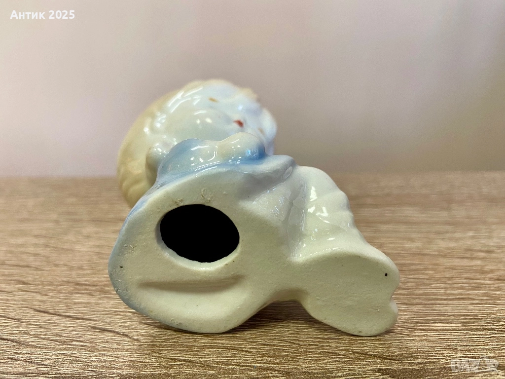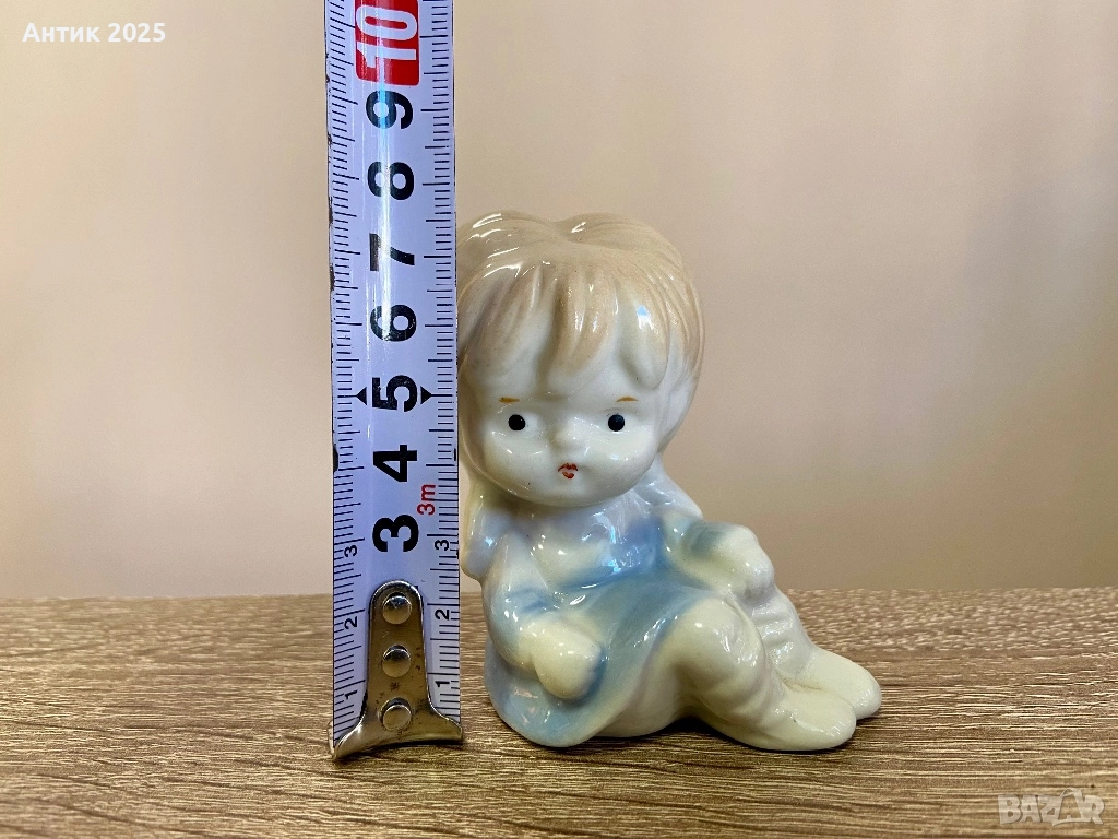 Малка винтидж порцеланова фигурка, изобразяваща седнало момиче. Фигурката е изпълнена в нежни пастелни тонове с прецизна ръчна декорация и гланцирана глазура. Трогателният образ и меките линии я превръщат в уютен декоративен акцент. Подходяща за колекционери, за интериорна декорация, детска стая или като мил подарък. Състояние: много добро за винтидж предмет, без отчупвания и пукнатини.
