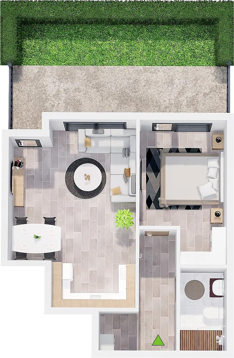 Апартаментът е с функционално разпределение, просторни помещения, отлична естествена светлина и възможност за модерно обзавеждане. В зависимост от разположението, жилището разполага с тераса или частен двор.