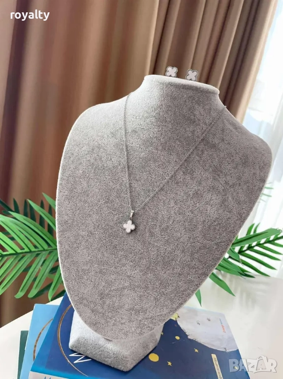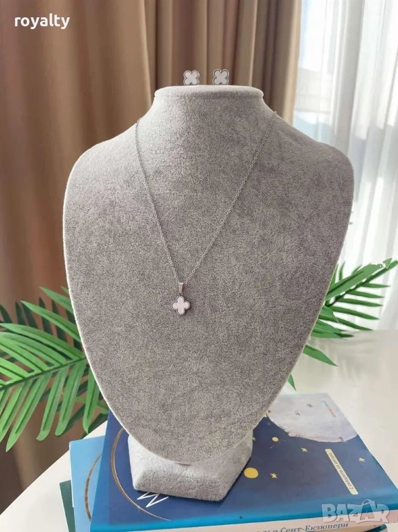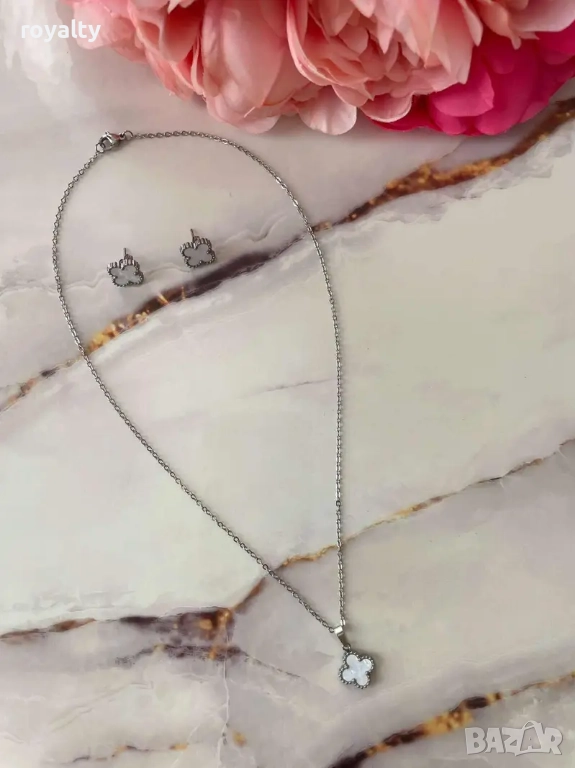 Дизайн: Цвят метал- сребрист, цвят декорация – бял . Сетът включва колие и обеци