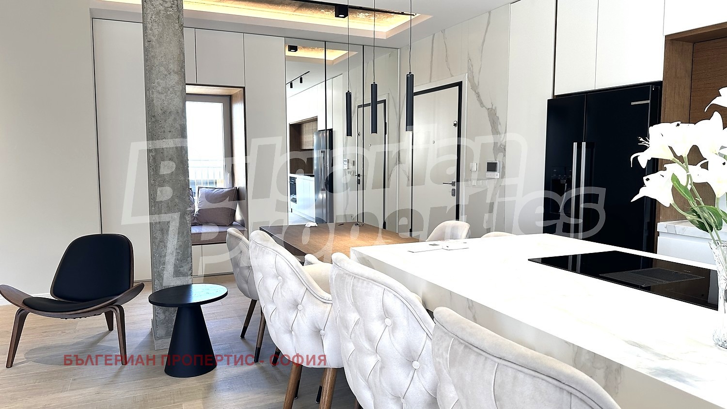 Просторната дневна обединява хол, трапезария и кухня в едно елегантно и функционално пространство. Меката мебел в неутрални тонове създава усещане за уют, а панорамните прозорци водят директно към терасата и разкриват прекрасни гледки. Декоративните елементи архитектурни колони с ефект, дизайнерско осветление, камина с модерен минималистичен дизайн подчертават характерния стил на жилището.