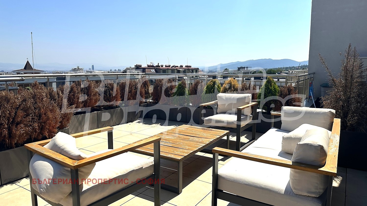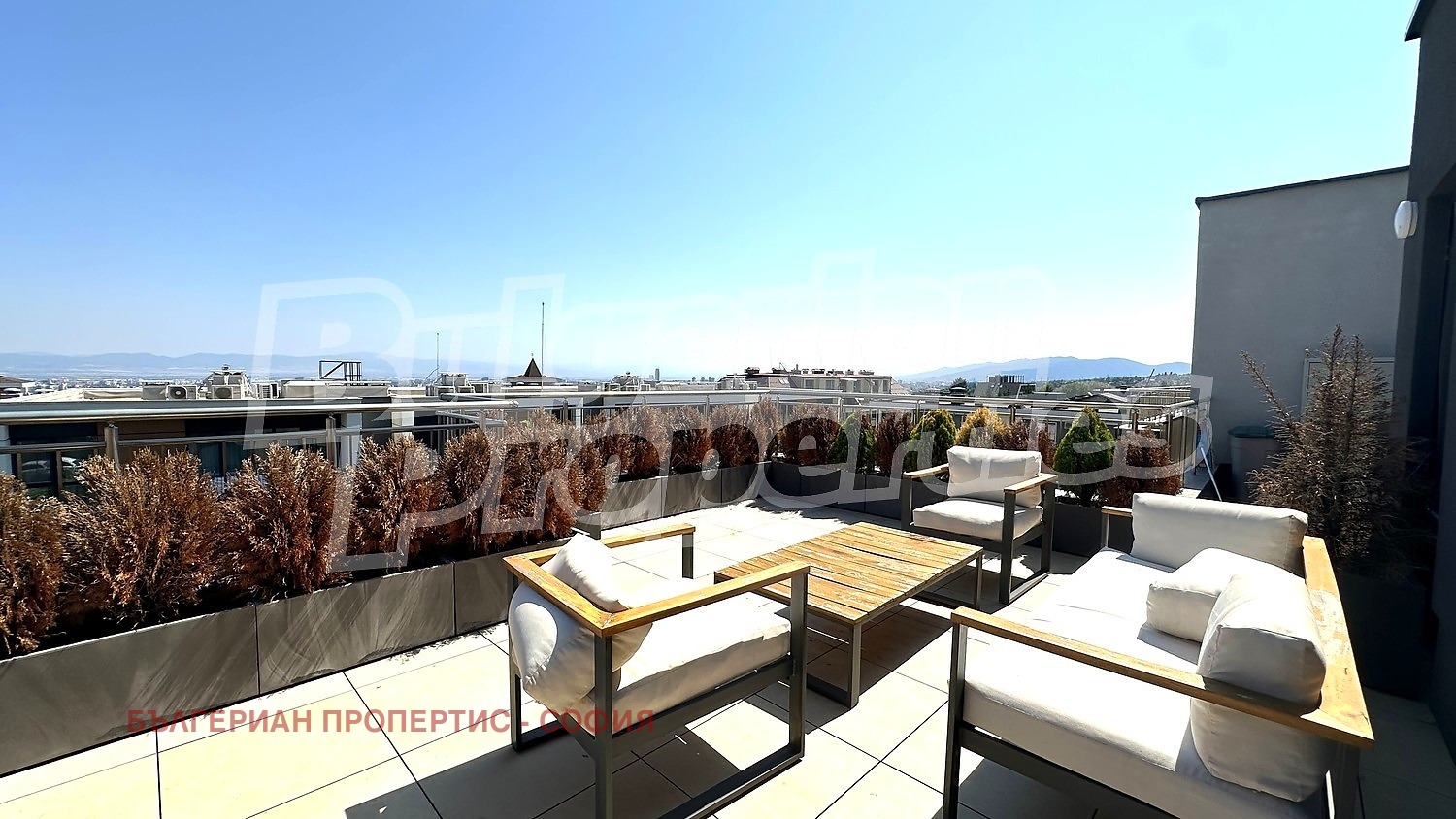 Имотът е с обща площ 237.78 кв. м., от които 98.46 кв.м чиста жилищна площ, 15.30 кв.м общи части и 124.09 кв. м. покривна тераса, обикаляща апартамента и разкриваща панорамни гледки към Витоша и София. По проект жилището е тристаен апартамент, но в момента е реализирано като изключително просторен двустаен, с усещане за свобода.