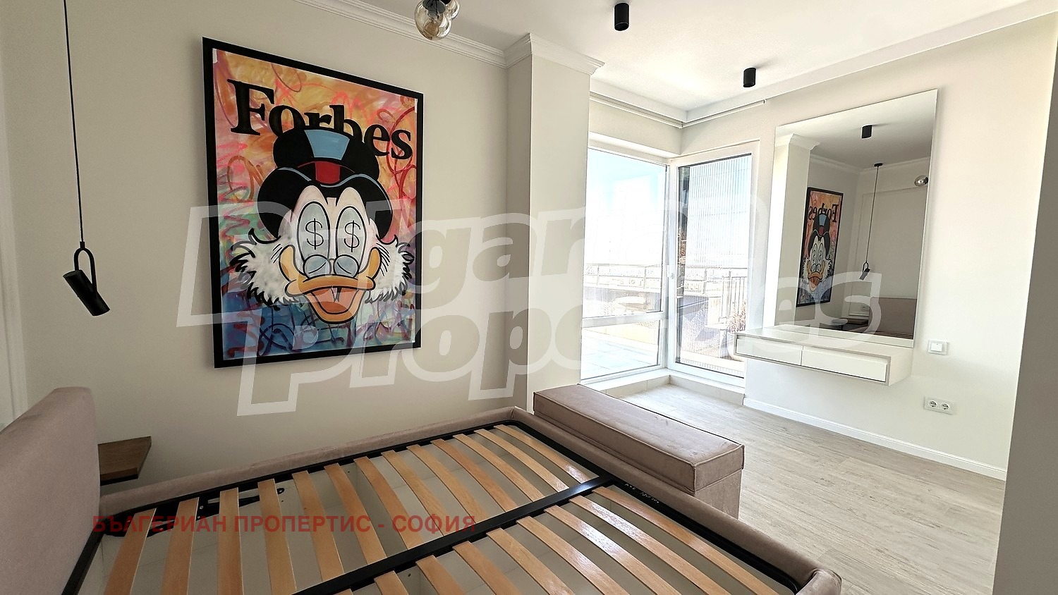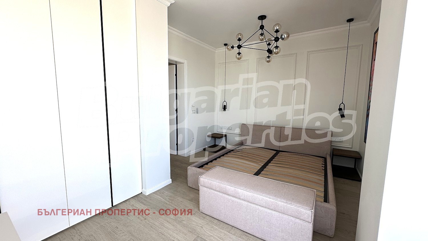 Спалнята е решена в топли и спокойни тонове, с мека тапицирана спалня, дизайнерско осветление и усещане за бутиков хотел.