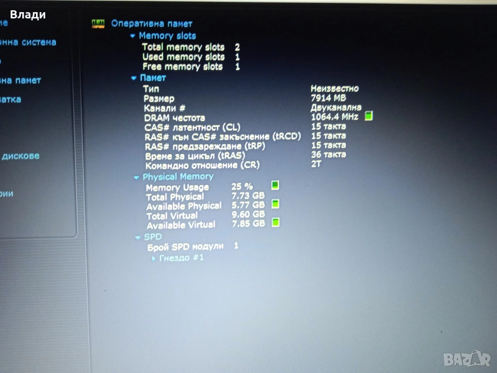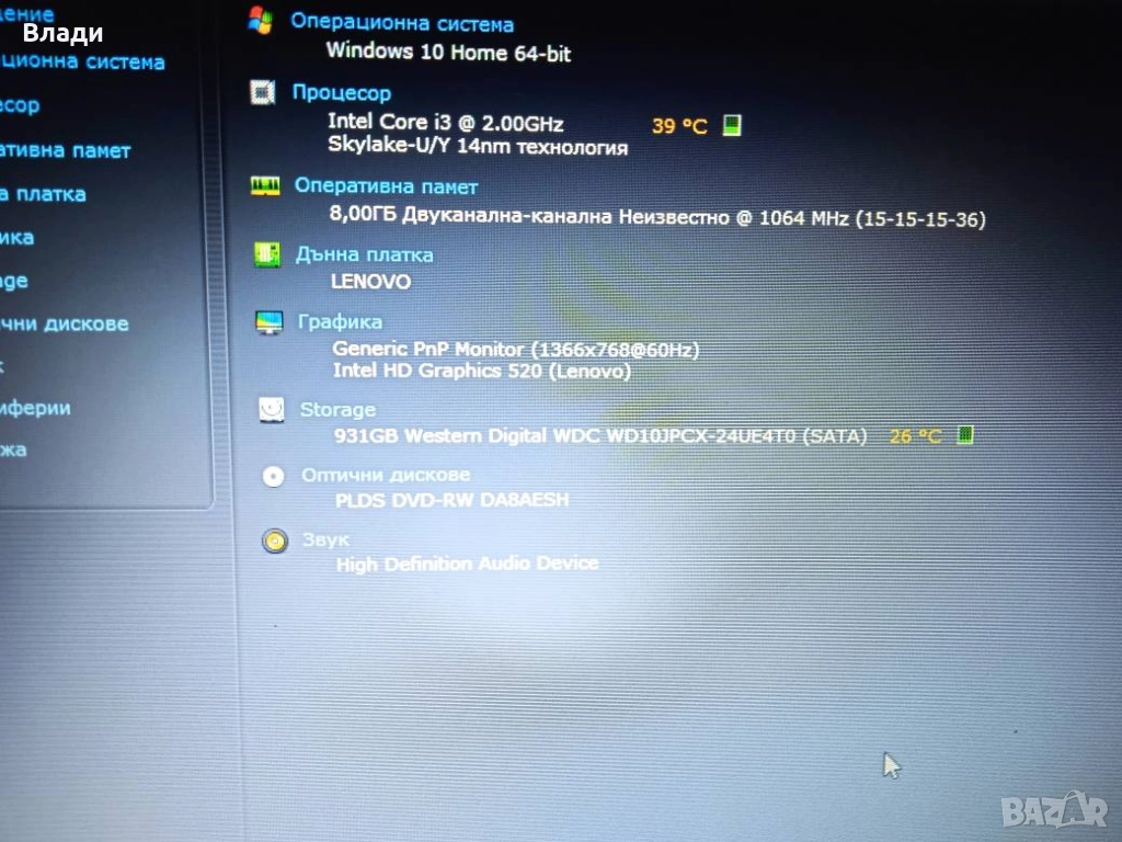 Инсталиран с Windows 64 bit,,HDD Sentinel,Speccy и Aida 64,за да се тества преди да се плати.