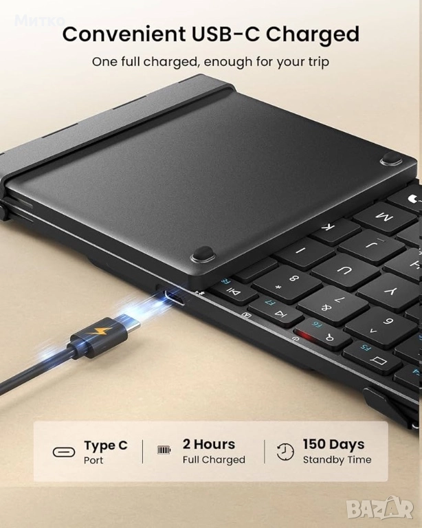 Трикратно сгъваема Bluetooth клавиатура】Пълноразмерна 105-клавишна подредба с 16,5 мм капачки за клавиши осигурява писане като на настолен компютър в преносим дизайн. Ултратънката плоска повърхност за писане (без накланяне) позволява лесна преносимост, а простият механизъм за сгъване и отваряне (без заключващи скоби) осигурява бързо разгъване.