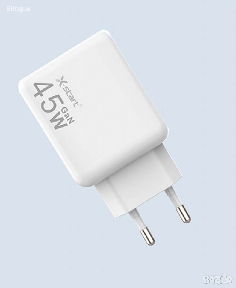 Двойно зарядно: Поддържа едновременно зареждане на две устройства; Портове: PD (Type-C) и QC (USB-A); Мощност: 45W; Технология: GaN (Галиев нитрид) за по-малки размери и по-висока ефективност; Бързо зареждане: Поддържа Power Delivery и Quick Charge стандарти; Цвят: Бяло или черно; Компактен и лек дизайн, идеален за пътуване. 1г гаранция