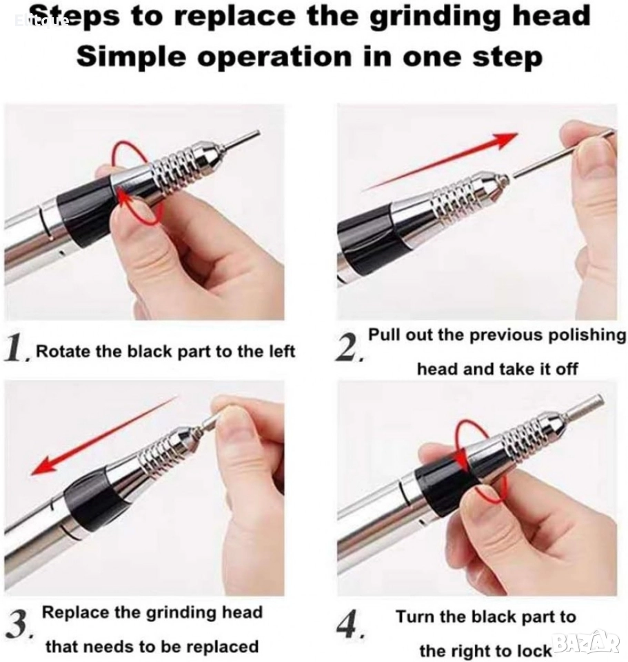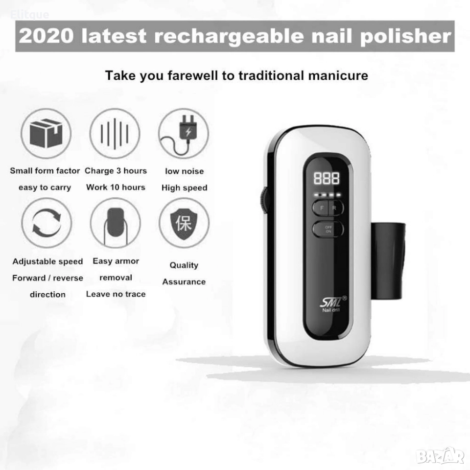 Скорост: 35000 об./ мин.;Размери: 15,5*7,5*2,5 см.;Материал: ABS + стомана;Мощност: 35W;Напрежение: 110-230 V;Приложение: Маникюр, грижа за педикюр; Акумулаторна и преносима: Има батерия от 2600 mAH;Компактна, лека, система за бързо зареждане: 4 часа пълно зареждане, след 10 часа зареждане за първи път;Живот на батерията: 8-10 часа;Регулируема посока и скорост: Регулируема скорост от 0 до 35 000 оборота в минута с контролния бутон за по-безопасно и лесно полиране на ноктите; Превключване на посоката на въртене напред/назад чрез натискане на десния бутон.Включени в комплекта: 6 броя диамантени накрайници за полиране, адаптер. Гаранция: 12 месеца.