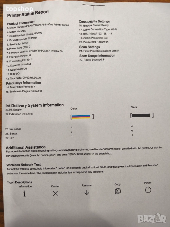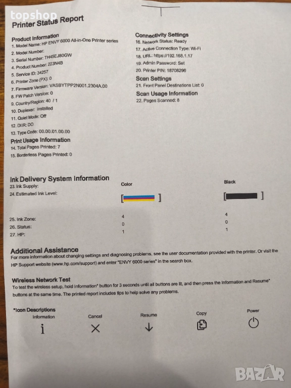 Гарантирано качество: Принтерът е преминал пълна проверка. Прикачвам снимка на статус страницата, която доказва минималното му ползване и перфектно техническо състояние.