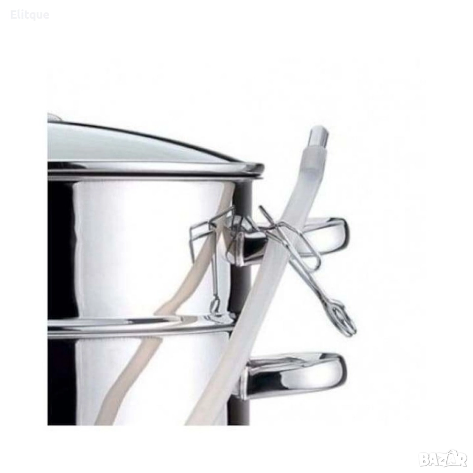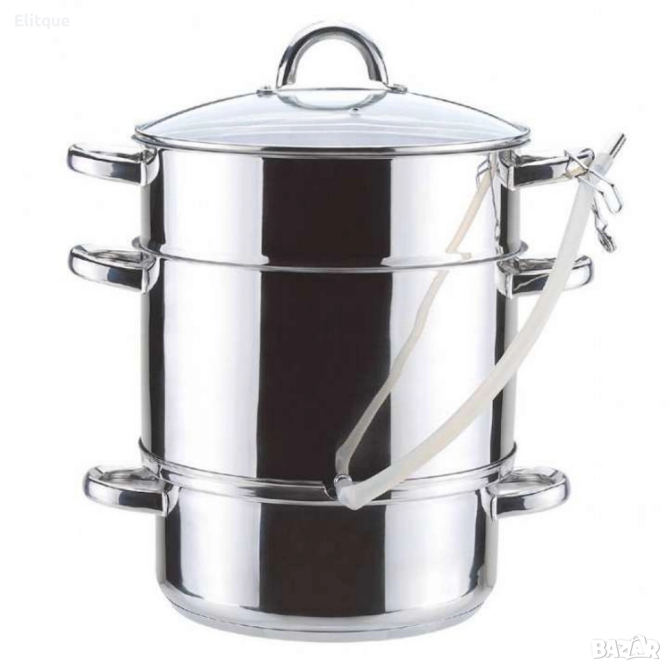 соковарка: 1. Стъклен капак. 2. Кош за плодове. 3. Събирателен съд за сок със скоба и тръба. 4. Парогенератор от неръждаема стомана. Соковарката от неръждаема стомана с оптимален обем от 8 литра е подходяща за приготвяне на сокове от плодове, зеленчуци и билки, както и на желе и ликьор. Извлича напълно хранителните вещества и фибри. Как се приготвя сок: В съд № 2 се слагат предварително подготвените плодове. В съд № 4 се налива вода до около 2-3 см под горния ръб на съда. Съд № 3 се поставя върху съд № 4. Преди да започнете процеса на извличане на сок, притиснете здраво изпускателната тръба и я поставете далеч от източници на топлина. Към плодовете, предварително поставени в съд № 2, добавете съответното количество захар. Покрийте с капака съда с плодовете. Така подготвения уред поставете на източника на топлина. След 15-20 минути свалете щипката от изпускателната тръба и съхраненият сок налейте директно в бутилки или буркани. След приготвяне на сока частите на парната соковарка се измиват в топла вода с меки почистващи препарати. Избягвайте твърди четки и химикали, които могат да повредят повърхността на съдовете. Съвети за почистване на соковарка Съдовете се почистват с топла вода и препарат и се избърсват. Не е препоръчително да се мият с корозивни вещества или остри предмети, които биха могли да наранят повърхността им. Газовият пламък не трябва да надвишава дъното на долния съд. Съветваме да разбърквате плодовете и зеленчуците с предмети, с които няма опасност да нараните съдовете. - Материал: Неръждаема стомана (Инокс) - Оптимален обем: 8 литра - Стъклен капак с отвор за пара - - Подходяща за всички видове котлони: газови, стъклокерамични, електрически, халогенни и индукционни - Лесна за използване - Дълъг маркуч със скоба за контрол на изтичането на сок