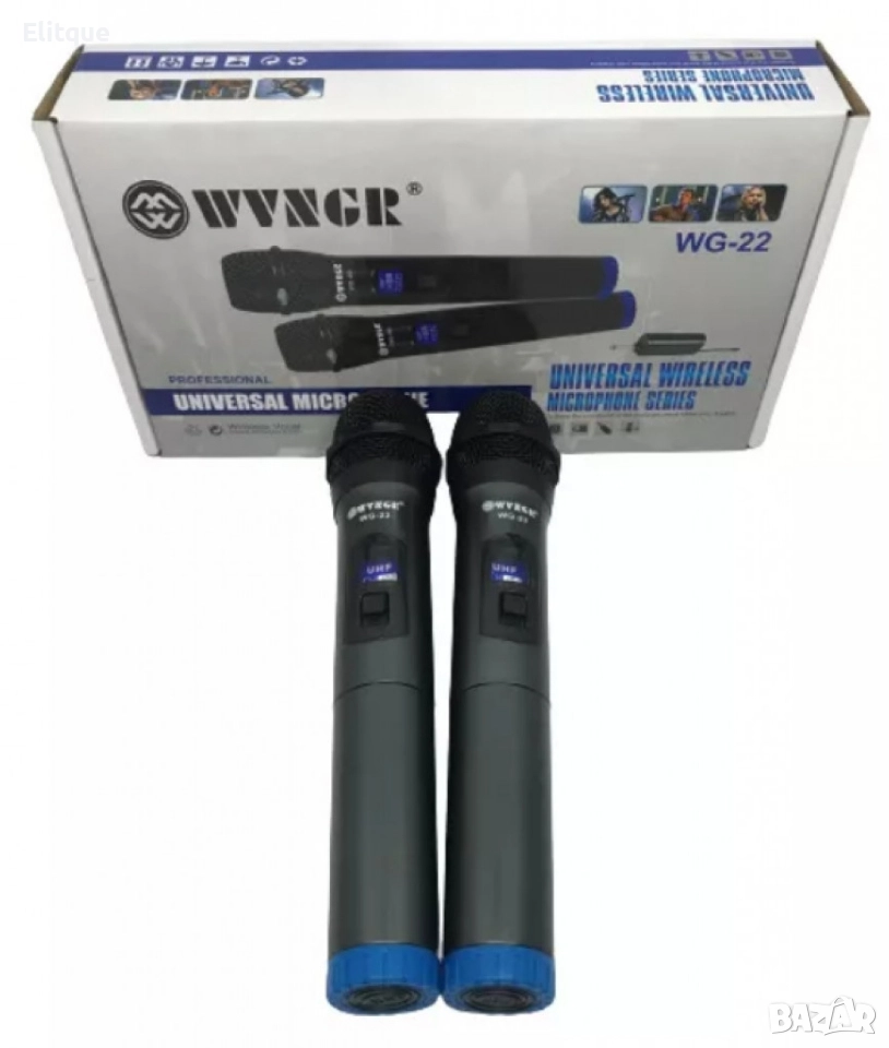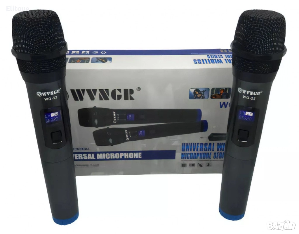 Име на продукта: Преносим безжичен микрофон с акумулаторен приемник; Вграден цифров дисплей; UHF тесен обхват: 863 - 865 MHz; Включен приемник с акумулаторна батерия (3,7 V - 2000 mA); Микрофонът работи с двойни A (AA) батерии; Универсален; Тип: Вокален; Приемник: 6,3 мм моно щепсел; Честотен обхват: 230,8MHz - 255,8MHz; Честота на приемане: 50Hz-18000Hz; Чувствителност на приемане: 90dB; Чувствителност -54 dB; Обхват на микрофона: до 50 метра на открито; Размер на микрофона: 240x40 mm; Микрофон: 2xAA батерии - за всеки микрофон; Захранващ приемник: 1x18650 батерия; Марка/Модел: WVNGR/WG-22; 12 месеца гаранция.