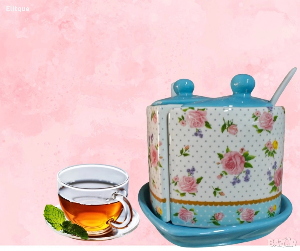 Тип продукт : Порцеланов сервиз ; Порцелановата захарница с красив дизайн във формата на сърце е перфектно допълнение към всяка кухня. Изработена с внимание към детайла, тя идва в комплект с две лъжички и чиния, които също следват елегантната форма на сърце. Този сет съчетава практичност и стил, като добавя романтичен акцент към вашите сутрешни ритуали или празнични моменти.