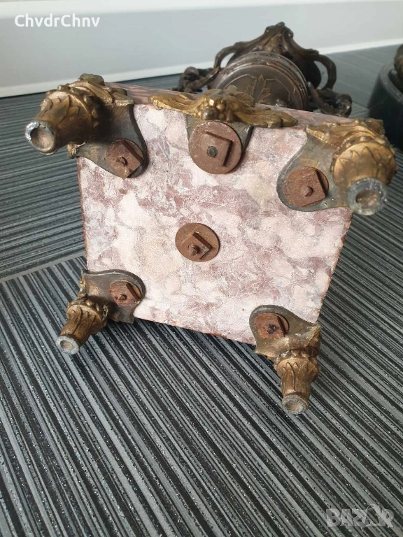 Декорациите по мраморната основа (крачета, фронтален орнамент) са от плътен жълт бронз с патина. Краката са закрепени за мрамора със стари/оригиналните болтове с квадратни гайки.