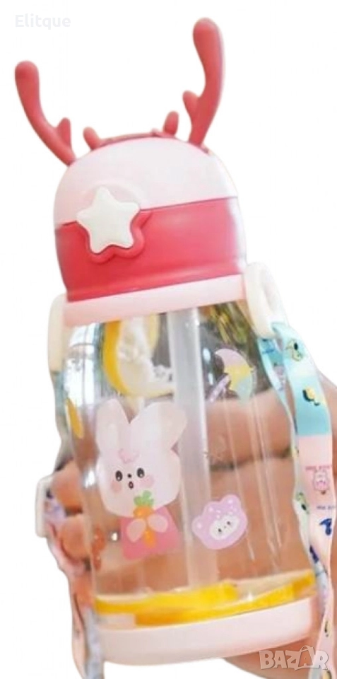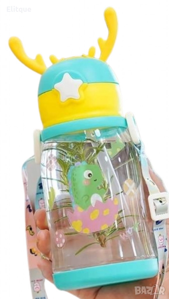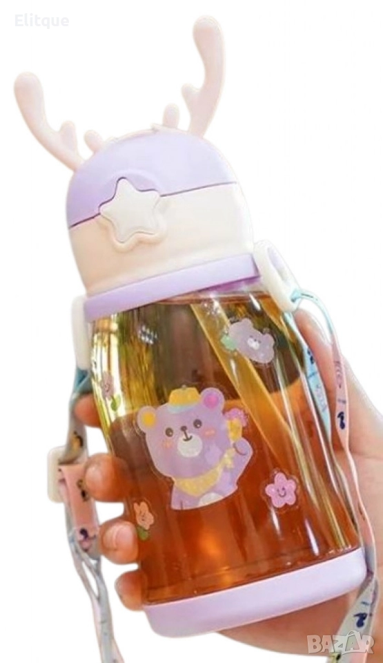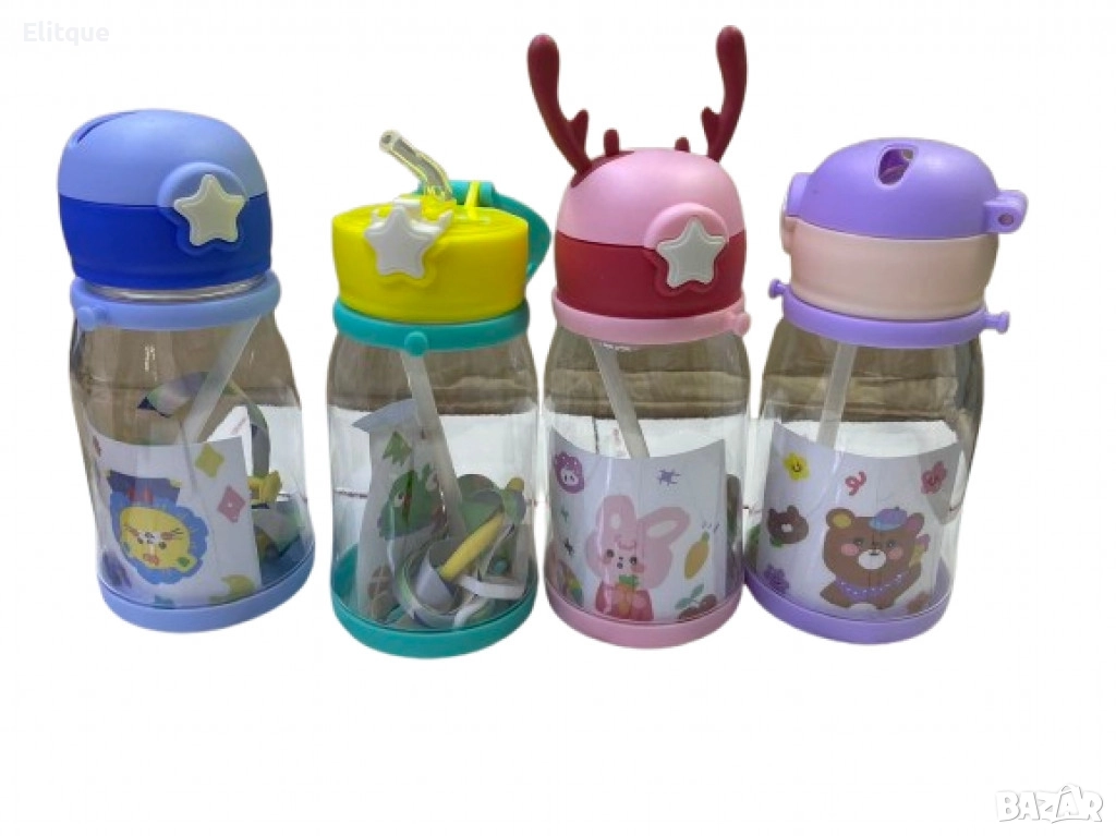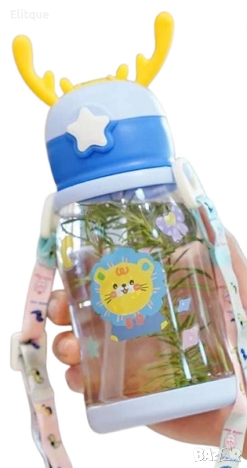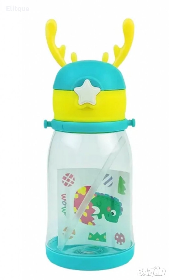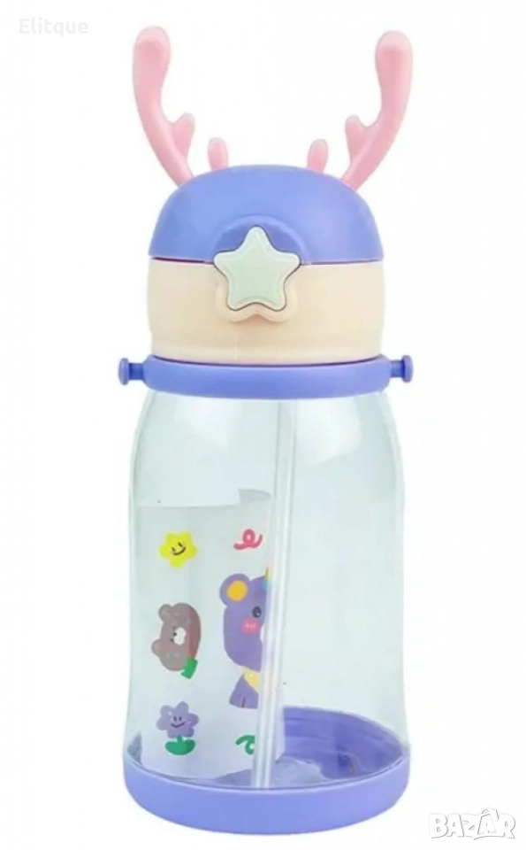 Вместимост: 600 мл; Силиконова сламка, която осигурява удобно пиене; Безопасен материал, който не съдържа вредни вещества; Защита против разливане; Лесно отваряне с едно докосване; Предлага се в 4 различни варианта; Вариант 1: Син цвят със стикер на лъв; Вариант 2: Синьо-зелен цвят със стикер на динозавър; Вариант 3: Розов цвят със стикер на зайче; Вариант 4: Лилав цвят със стикер на мече.