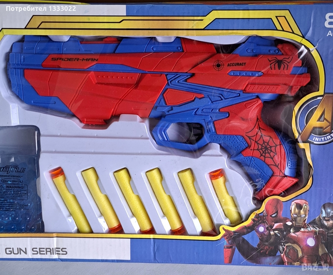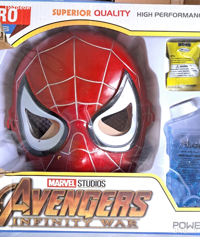 Детски пистолет който изтрелва меки дунапренови патрони и водни бомби .Маска на Спайдърмен. Подходящ за деца 8+. Комплектът е използван много малко. Като нови е .