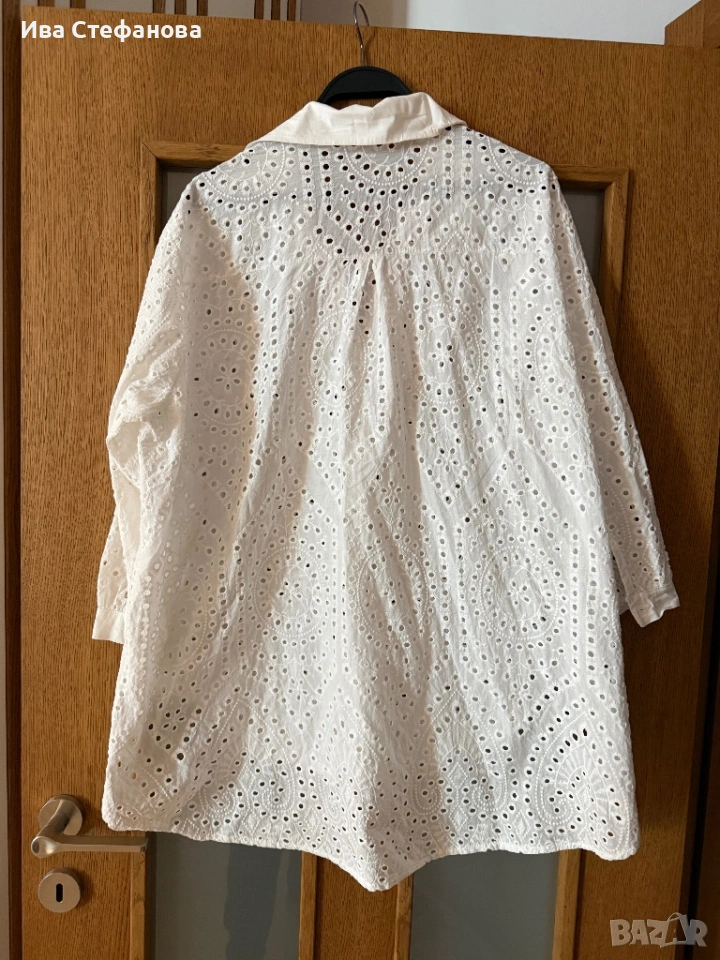 Нова универсален one size бяла елегантна риза 100 % памук памучна рязяна дантела Италия Italy .Дължина 84 в дългата част , отпред 70 см , бюст свободна лежерна кройка до 118 см . Разгледайте и другите ми обяви .