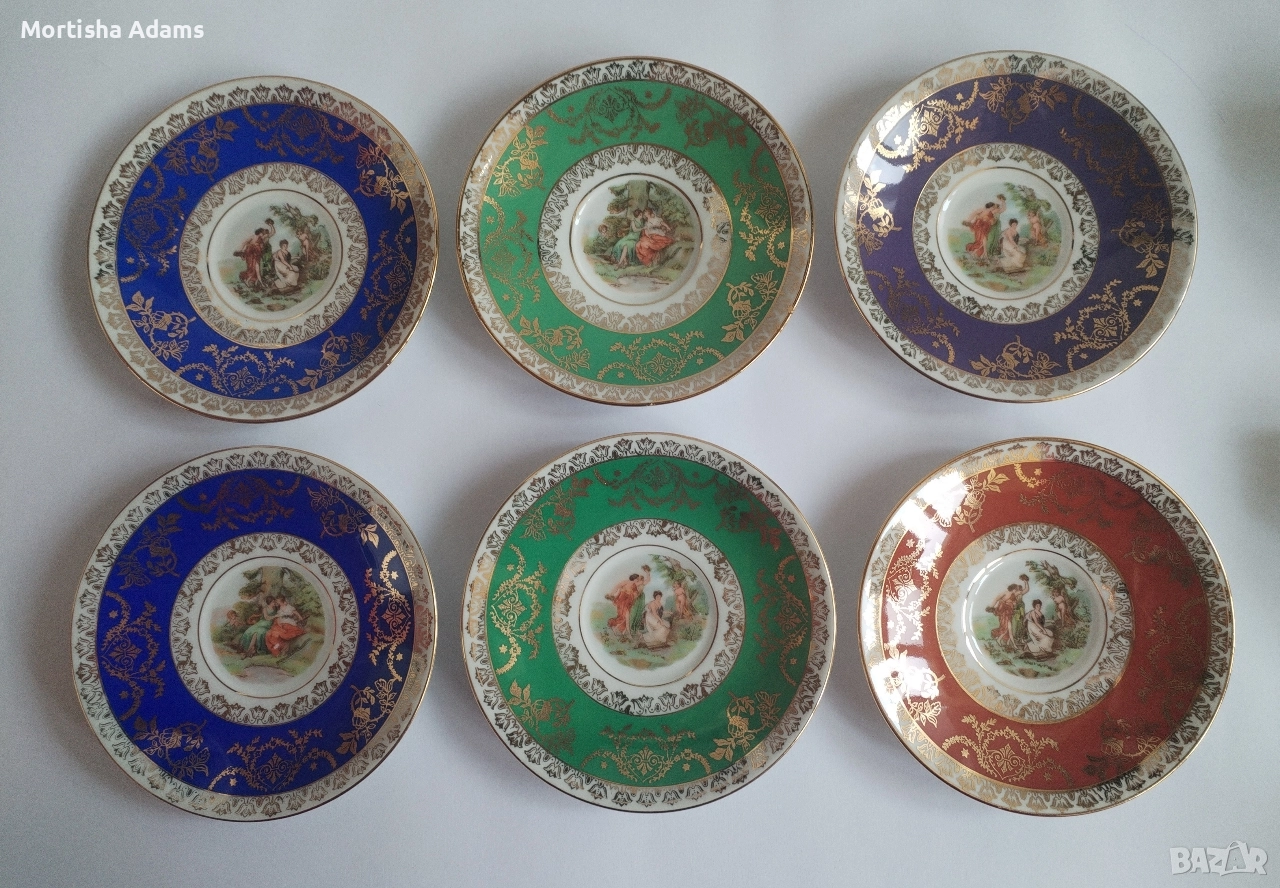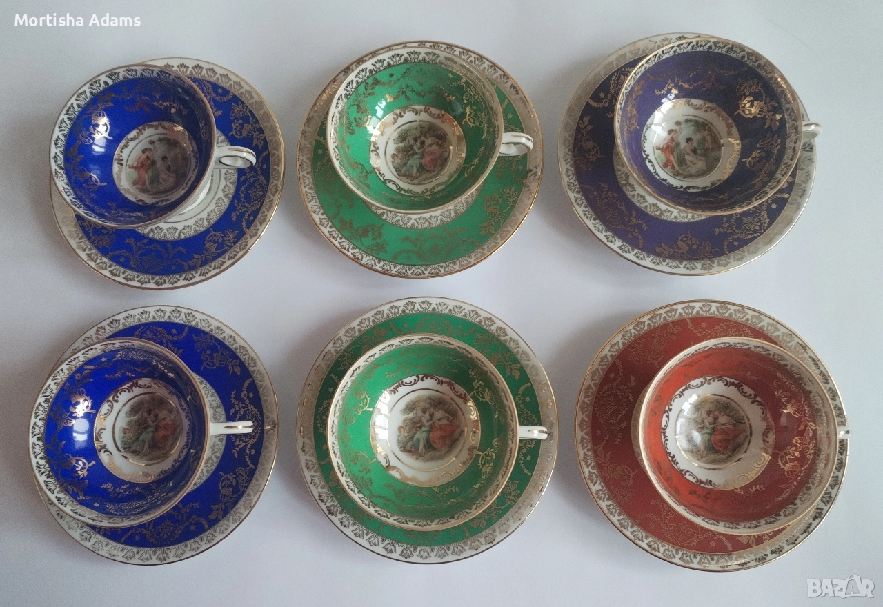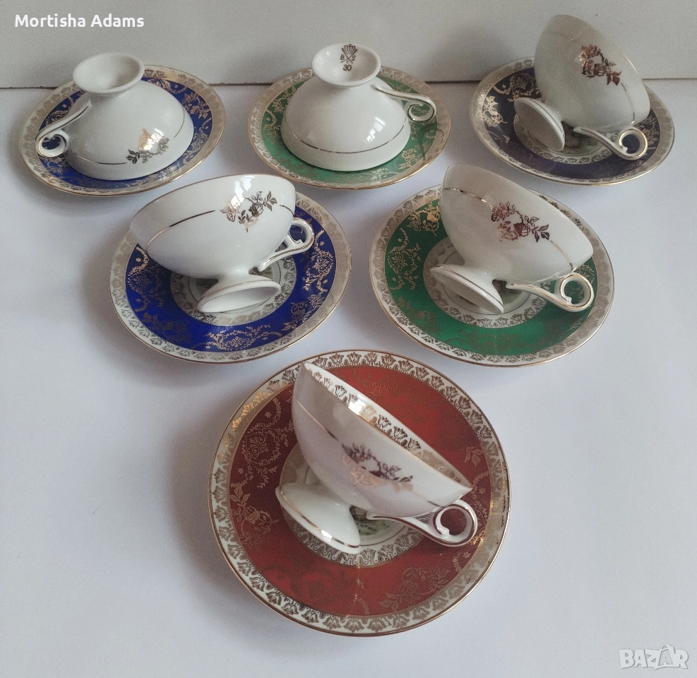 Шест великолепни сета за кафе с чашка 80мл. и чинийка с диаметър 11,5см., за които снимките говорят по- добре от думите... . Отлично състояние, без следи от употреба, период 1968-1974г.