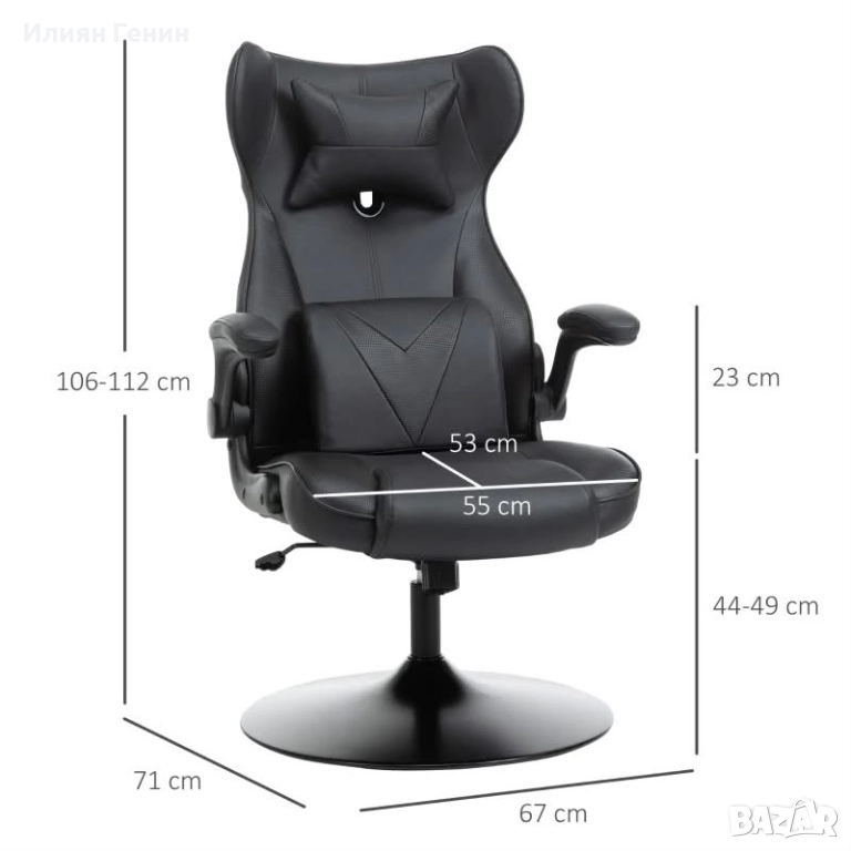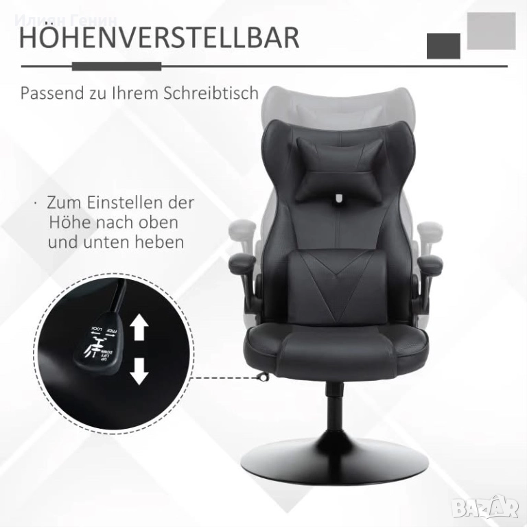 Геймърски стол Vinsetto, люлееща се функция, лумбална възглавница, регулируема височина, изкуствена кожа, 67x71x112 см, черен - 350.00лв.