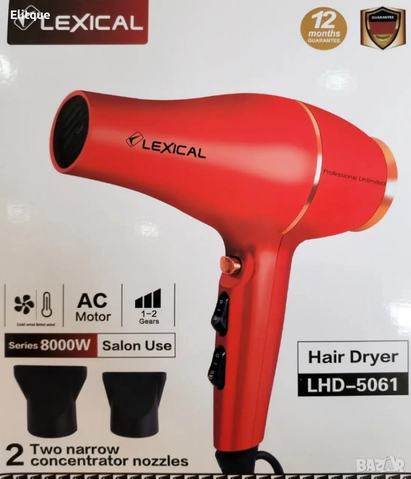 Захранване: AC 220-240V~50/60 Hz; Мощност: 2200 W; Скорости: 2 скорости и 2 ключа за отопление; Функция за хладен вятър; Защита от прегряване; Примка за окачване; Дюзи: 2 дюзи за концентратор; Цветове: Син, Червен.