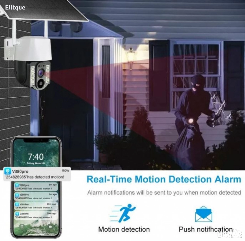 Резолюция: 8MP, 3840x2160 (4K) за кристално ясни видео изображения с висока детайлност; Датчик за движение: Интелигентен сензор, който задейства запис и известяване при засичане на движение; Нощно виждане: Инфрачервен LED обхват до 20 метра за надеждно видеонаблюдение през нощта; Вградена батерия: Осигурява продължителна работа дори при липса на слънчева светлина или захранване чрез USB; Слънчева мощност: 5W соларен панел, който поддържа работата на камерата през целия ден; Водоустойчивост: Степен на защита IP66, устойчива на дъжд, прах и тежки климатични условия; Вграден високоговорител: 3W мощност за силен и ясен звук, използван при двупосочното аудио; Приложение: Поддръжка на V380 Pro за лесно управление и наблюдение от разстояние.