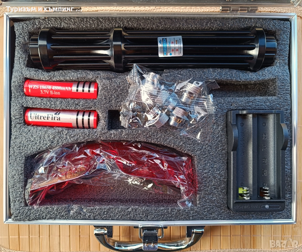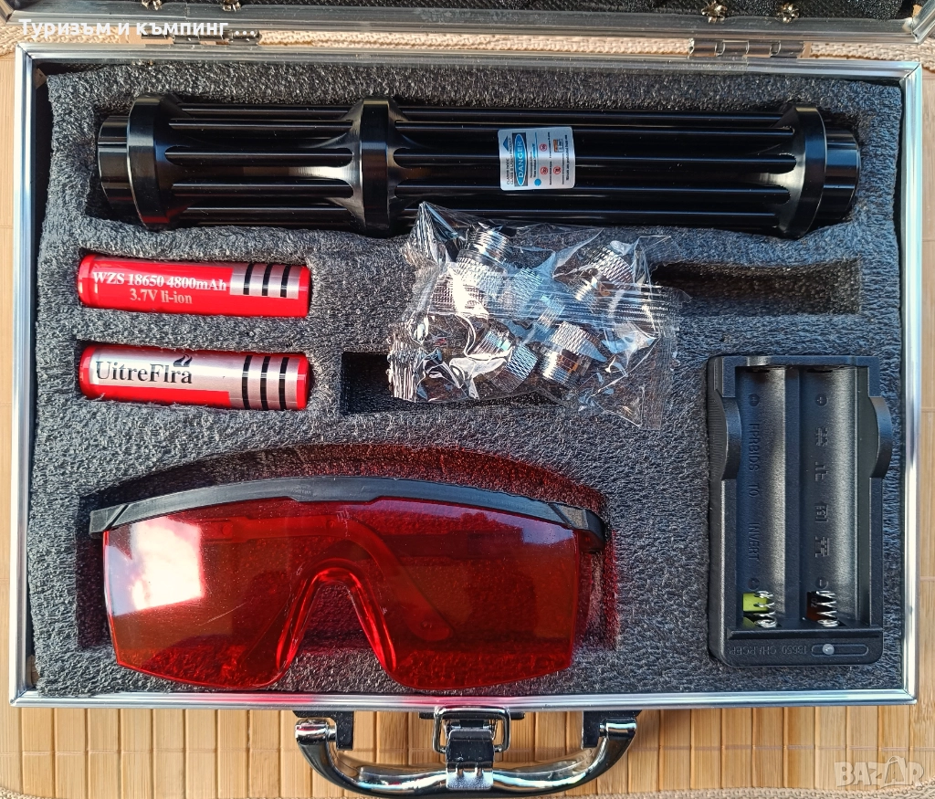 Мощен син акумулаторен лазер 5000mW с 5 приставки пука балон, запалва клечка кибрит или цигара с предпазни очила, две акумулаторни батерии 18650 и луксозна кутия тип куфарче/ от алуминий.