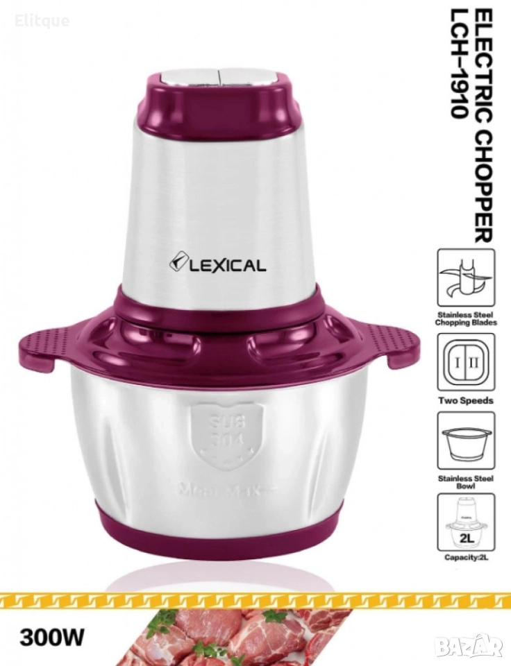 Напрежение: 220-240V~50/60 Hz; Мощност: 300 W; 2L купа от неръждаема стомана за максимална издръжливост и капацитет; 4 остриета от неръждаема стомана, осигуряващи прецизно и равномерно рязане; Подвижен прът за рязане за лесно почистване и поддръжка; Цвят на теглича: Лилав или син.