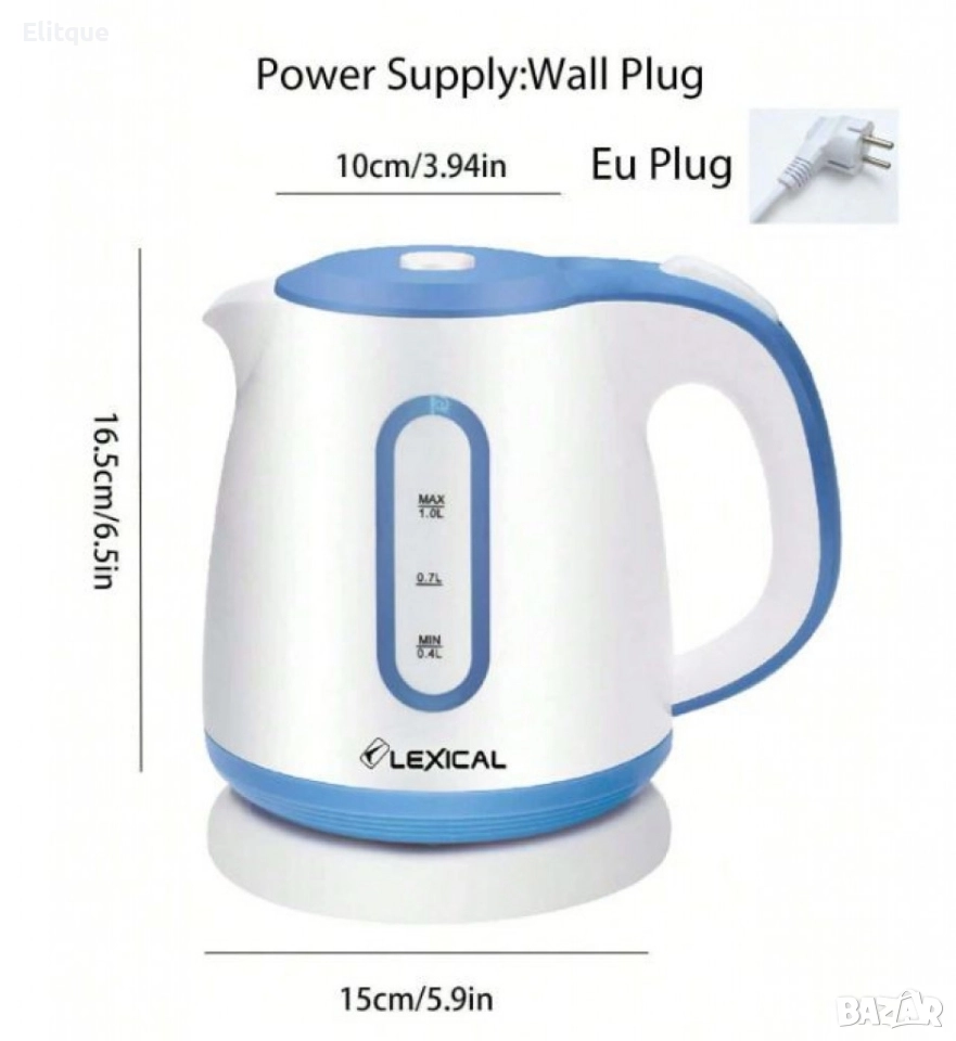 Капацитет: 1 литър, идеален за приготвяне на няколко чаши напитки едновременно; Мощност: 1200W, осигуряваща бързо и ефективно загряване на водата; Корпус: Пластмасов, лек и лесен за поддръжка; LED индикатор: Показва състоянието на загряване на водата; Безжична основа: 360° въртяща се основа за удобство при използване; Автоматичен стартер с един бутон: Лесно стартиране на процеса на загряване; Автоматично изключване: За безопасност при достигане на кипене; Защита от сухо изгаряне: Автоматично изключване при липса на вода, предотвратяващо повреди и осигуряващо безопасност. 24 месеца гаранция.