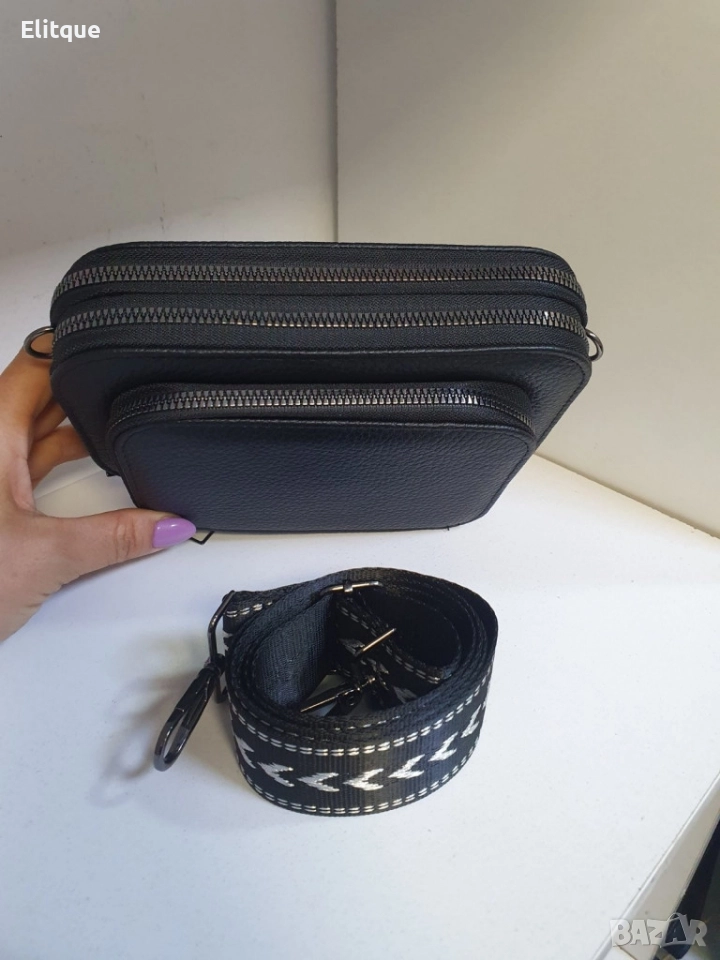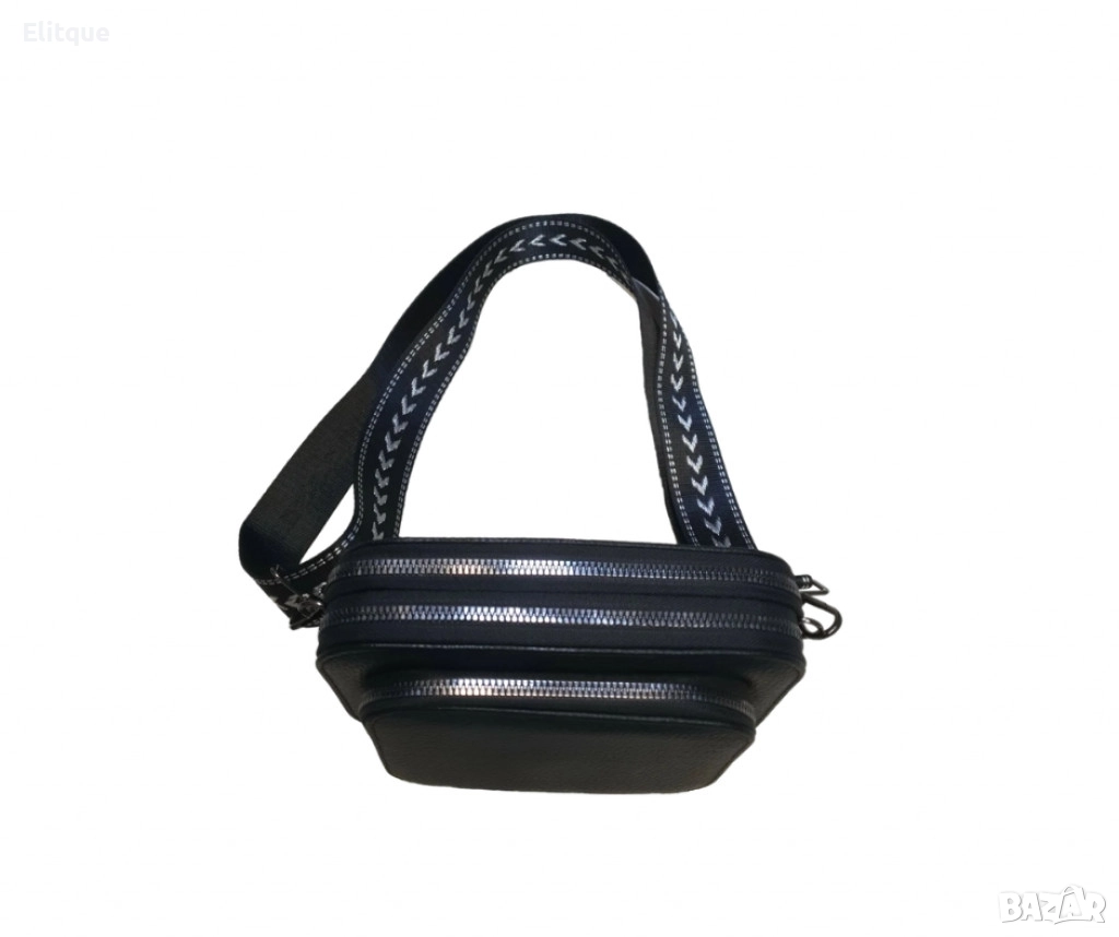 Тази черна чанта с широк колан е перфектният избор за всяка жена, която иска да добави елегантност и практичност към своето ежедневие. Независимо дали я носите на работа, на разходка или на вечерно излизане, тя ще допълни вашия стил и ще се грижи за вашите вещи с надеждност и стил. Материал: Висококачествена к, устойчива на износване; Размери на чантата: Приблизително 23 см (дължина) x 15 см (височина) x 8 см (ширина); Колан: Широк колан с дължина около 120 см, регулируем за персонално удобство; Закопчаване: Двойни ципове за основните отделения; Цвят: Черен с бели декоративни елементи на колана; Допълнителни отделения: Две основни отделения с ципове, вътрешни джобове за по-добра организация на вещите; Тегло: Лека и удобна за носене, подходяща за ежедневна употреба.