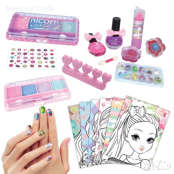 Лилав куфар играчка с дръжка. Съдържа 4 гланца за устни, 1 червило, 2 лака за нокти, 4 сенки за очи, гъби за разделяне на нокти, комплект изкуствени нокти с лепило, стикери за нокти и 6 листа за оцветяване за занаяти.