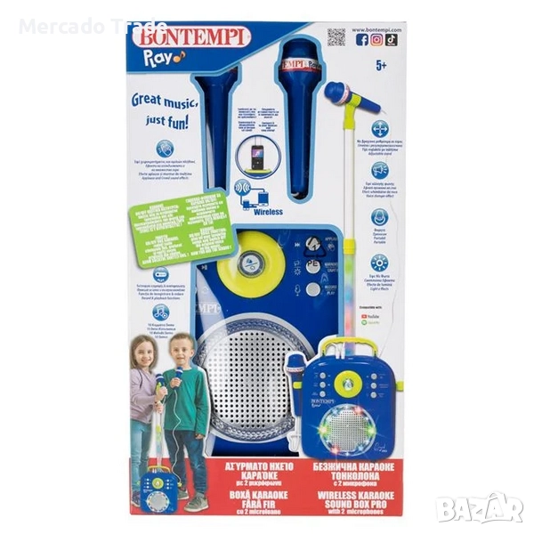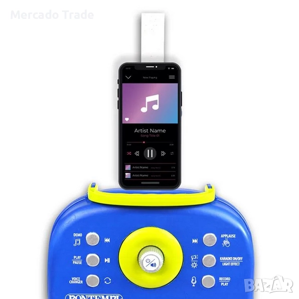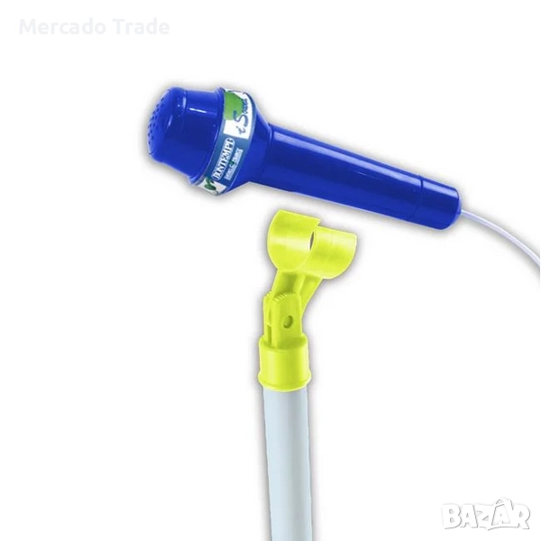 Караоке комплект с 2 микрофона, светлини, музика и стойка. Има бутон On/Off, звуци на барабани, демо музика, аплодисменти и бутон за сила на звука.