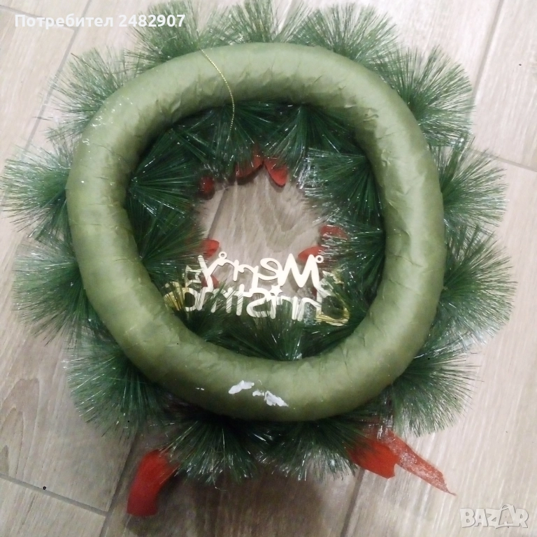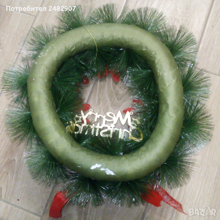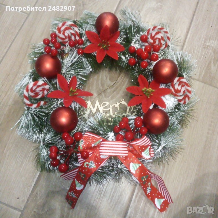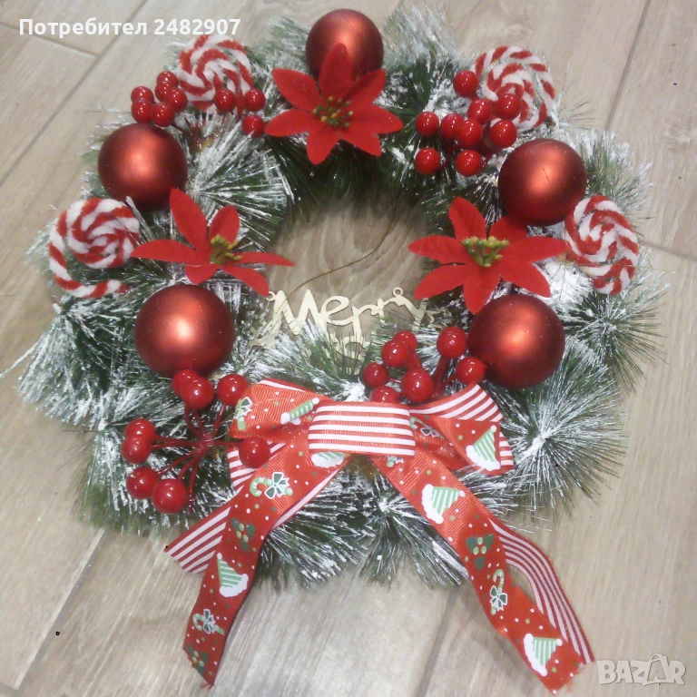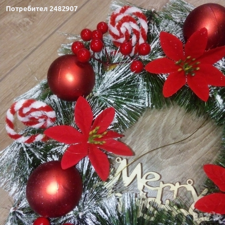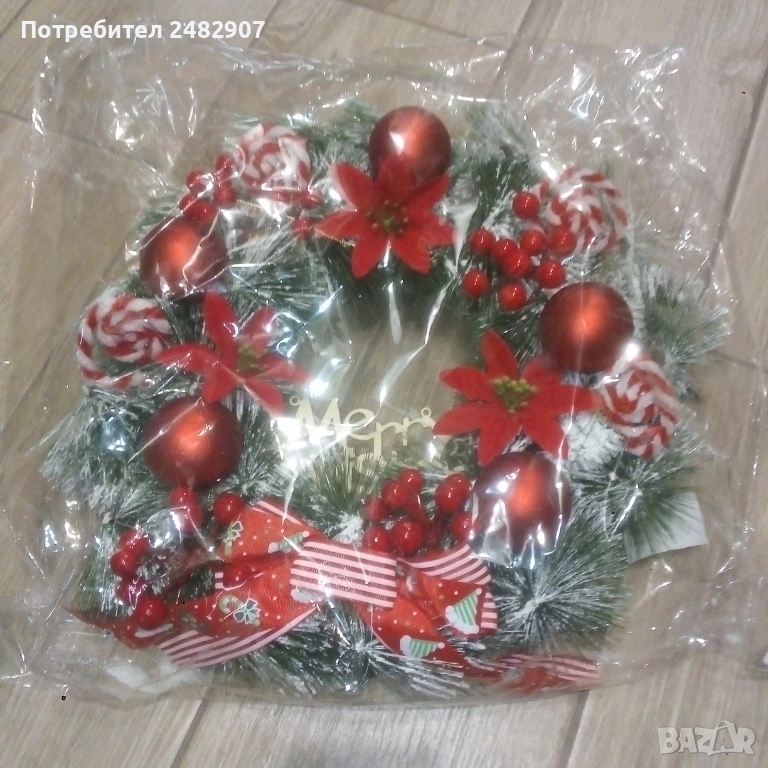 Голям коледен венец за окачване, богато украсен с изкуствени материали. Диаметър - около 35 см, дебелина - около 11-12 см. Чисто нов, не е използван, ефектен, красив, подходящ за украса, декорация или подарък.