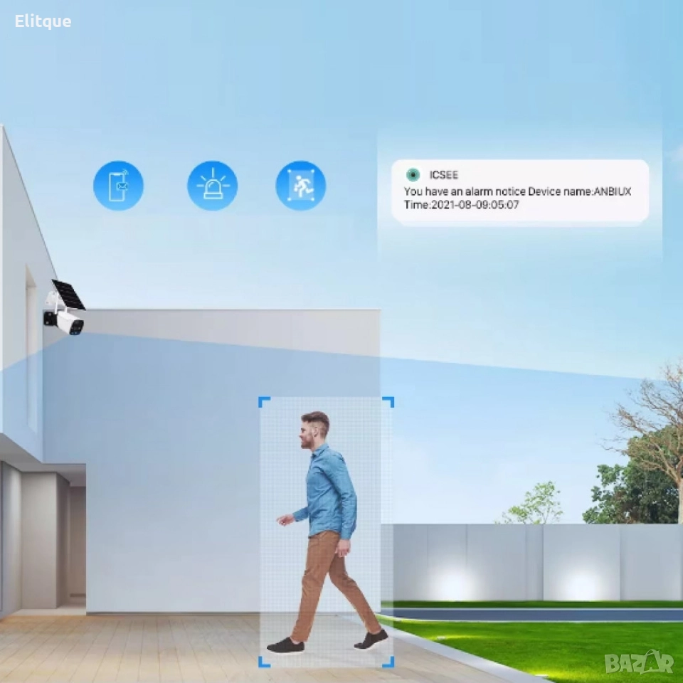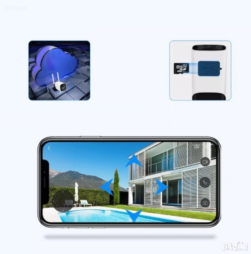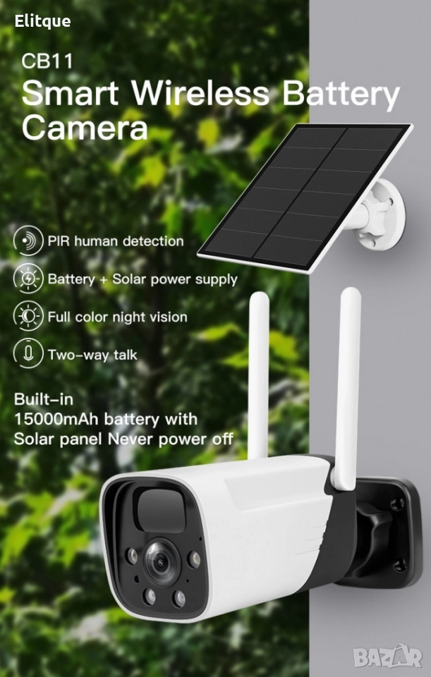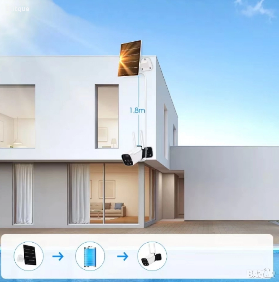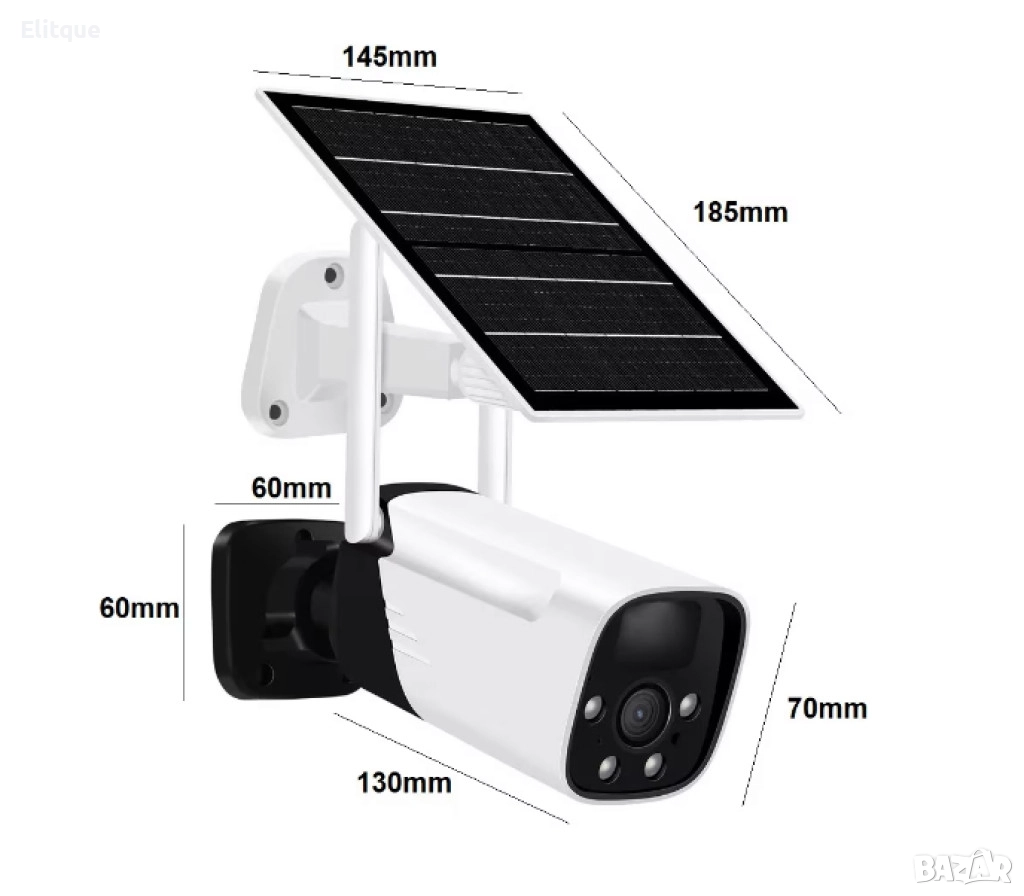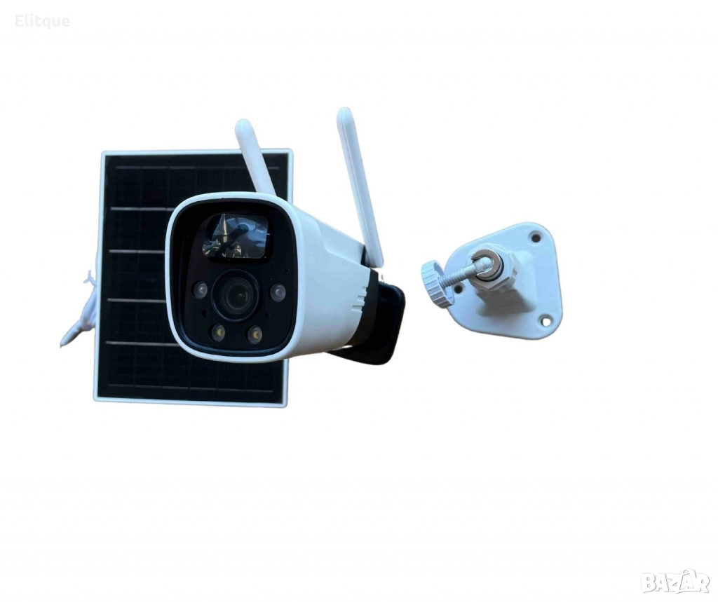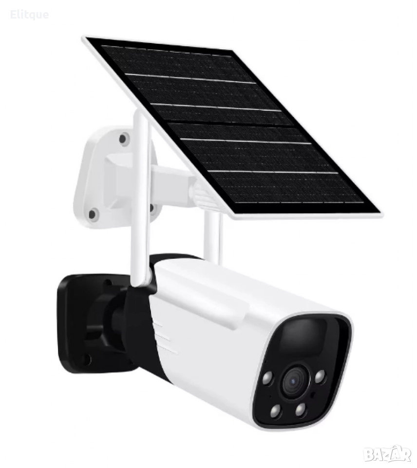 соларна камера; Скорост на трансфер (Mb/s): Wi-Fi 802.11 b / g / n (2.4G); Дълбочина на цвета (битове): 128~4096kbps; Минимално осветление (лукс): 0.3; Лещи: 4mm; Захранване: Презареждаща се батерия, слънчев панел; Вградени микрофон и високоговорител; Micro USB; LED индикатори: Да; Размери камера (mm) 130 x 60 x 70 мм.; Степен на защита: IP66; Материал: ABS; Батерии: 2x вградени тип 18650; 3.3W соларен панел; Детекция на движение: Да, вграден PIR сензор; Поддържа micro SD карти с капацитет до 128 GB (не са включени); Висока разделителна способност: 1920 * 1080 (Full HD); IP66 водоустойчив; Работна температура: -30 до 50 градуса по Целзий; Поддръжка на системи: IOS и Android; Приложение: iCSee; Цвят: Бял+черен. Гаранция: 1 г.