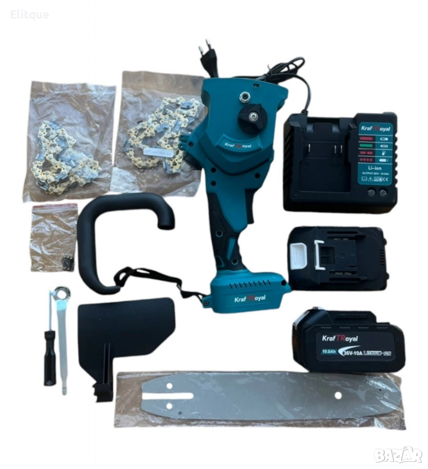 Мощност: 36V; Капацитет на батериите: 2х 10000mAh (10Ah) Lion; Висока скорост на рязане; Скорост на веригата 7,5m/s; Автоматично смазване; Бързо зареждащо зарядно до 50 мин.; Здрав и удобен пластмасов куфар за лесно транспортиране; Важно е веригата да се регулира правилно, прекалено натегнатата верига може да изгори мотора! Включени в комплекта: 2х вериги; 1х шина; 1х отвертка; 2х батерии; 1х зарядно. Гаранция: 24 месеца.