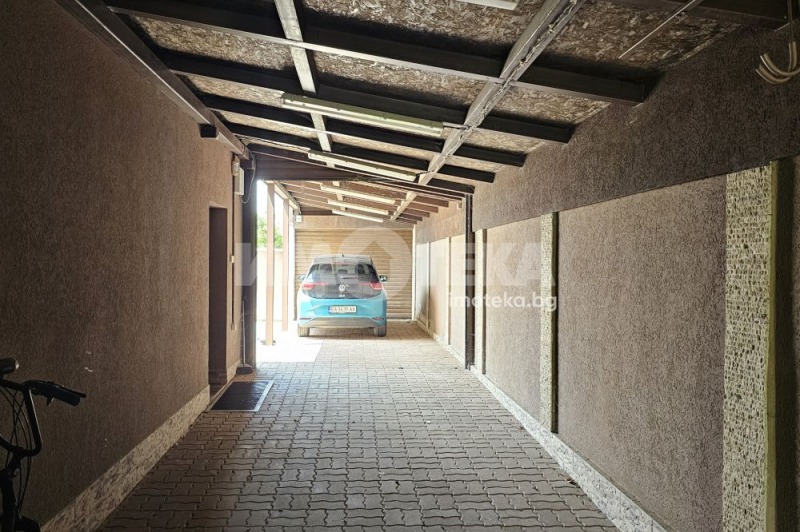 1420 кв.м. озеленен, равен двор с овощни дръвчета. Плътна ограда за пълно уединение. Поливна система със собствен водоизточник. Покрито външно барбекю с трапезария. Автоматична гаражна врата и покрит паркинг за 4 коли