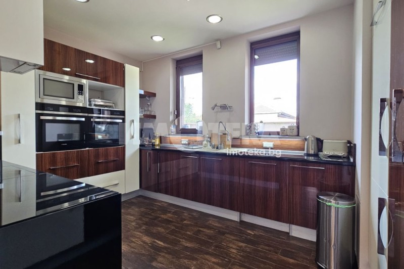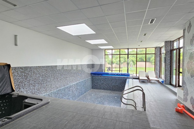 Първи етаж: Просторна дневна с мека мебел, трапезария и голяма кухня с вградени уреди, 2 спални, баня с тоалетня към едната спалня. СПА зона с мини басейн за 6 души, с подводен масаж и цветотерапия, закрит басейн, сауна и баня с тоалетна.