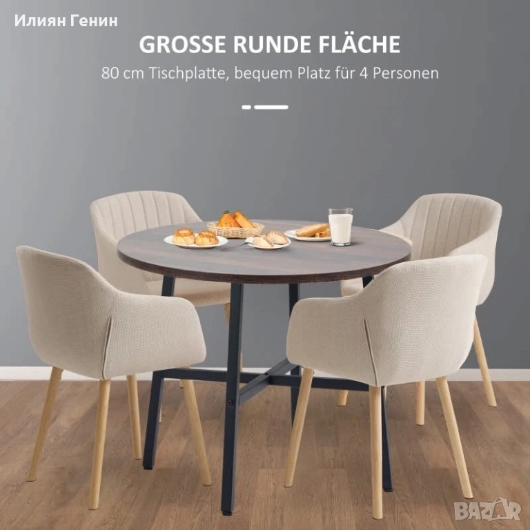 Голям плот: С диаметър 80 см, тази маса за хранене предлага достатъчно място за четирима души, които да се хранят удобно заедно. Това я прави подходяща не само за семейни хранения, но и за социални събирания, като например игрови вечери.