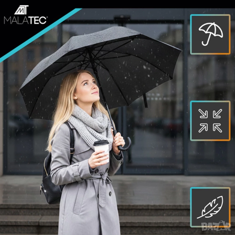 Големият автоматичен чадър Malatec предлага надеждна защита от дъжд и вятър и е идеален за ежедневна употреба. Лек, компактен и изключително здрав, той е идеален за пътуване и лесен за носене в чанта или раница.