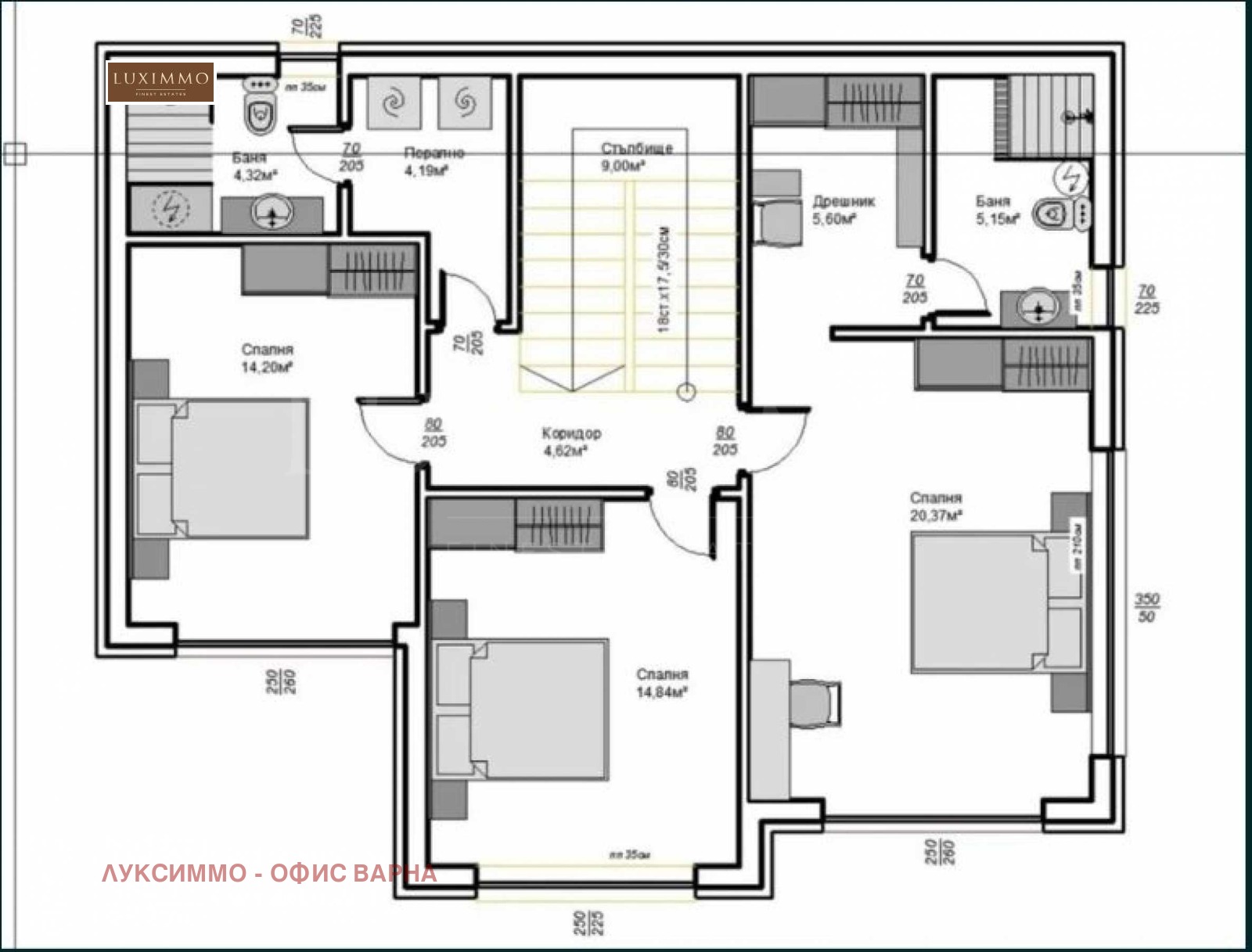 родителска спалня 20,37 кв.м с дрешник 5,60 кв.м. и баня с тоалет 5,15 кв.м.