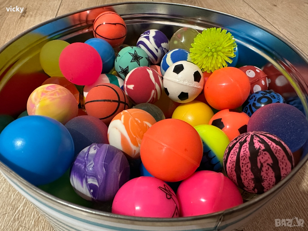 Микс от подскачащи силиконови/гумени топчета за вендинг машини. Купувани са "за спорта" и просто съхранявани - без следи от употреба, неразличими от нови. Това е и причината да посоча състоянието им като такова! Посочената цена е за всички (ориентировъчен брой 100) !