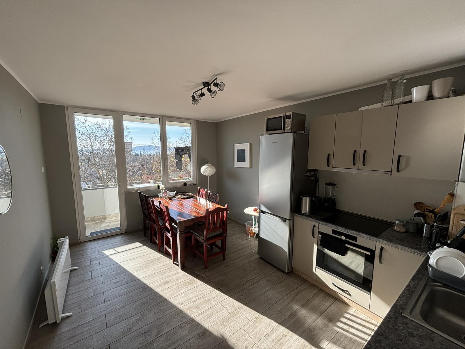 Просторна трапезария и кухненски бокс, които придават на жилището модерен стил, удобство и уют. Мебелите от естествено дърво - масивната маса и трапезните столове са акцент и подчертават домашния облик;