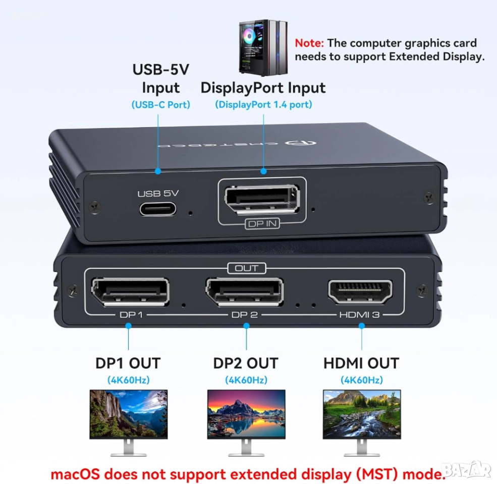 Този DisplayPort сплитер с 1 вход и 3 изхода позволява свързването на един DisplayPort източник към до три дисплея (2× DisplayPort и 1× HDMI), което намалява смяната на кабели и подобрява ефективността на работния процес. Той поддържа изход с висока резолюция до 4K, което позволява плавни настройки на няколко екрана както за огледални, така и за разширени дисплеи на Windows системи, като macOS поддържа само огледален изход. Сплитерът осигурява стабилно предаване на видео без загуби, когато се използва със съвместими устройства и подходящи кабели, изисква директно свързване към DisplayPort източник и трябва да се захранва външно чрез USB-A към USB-C за работа. С истинска plug-and-play функционалност и без необходимост от инсталиране на драйвери, той е подходящ за професионални, търговски и домашни мултимедийни среди, като презентации, цифрови табели, видеоконферентна връзка и работни станции с няколко дисплея.