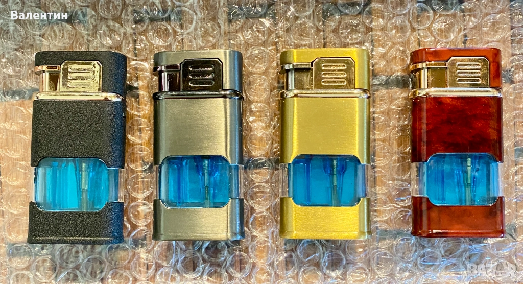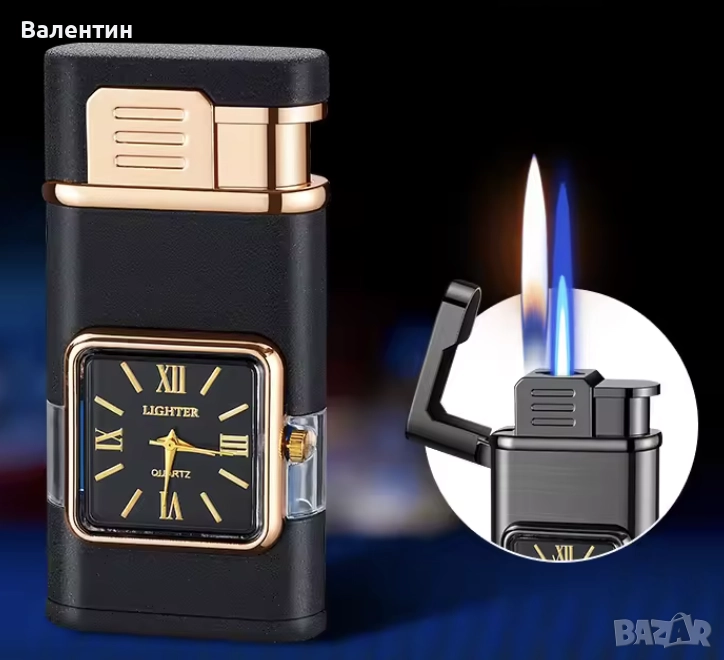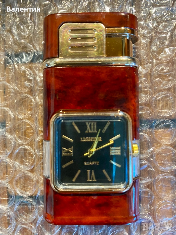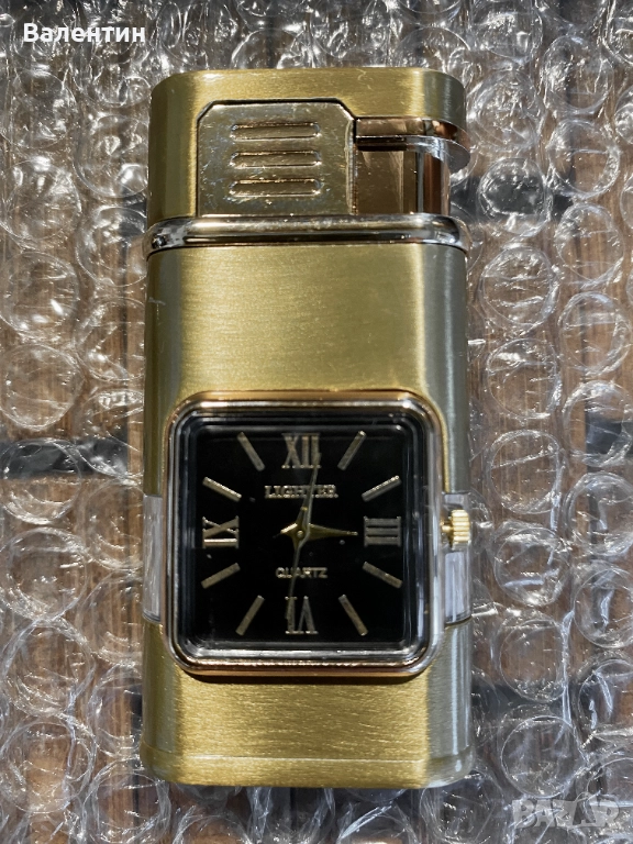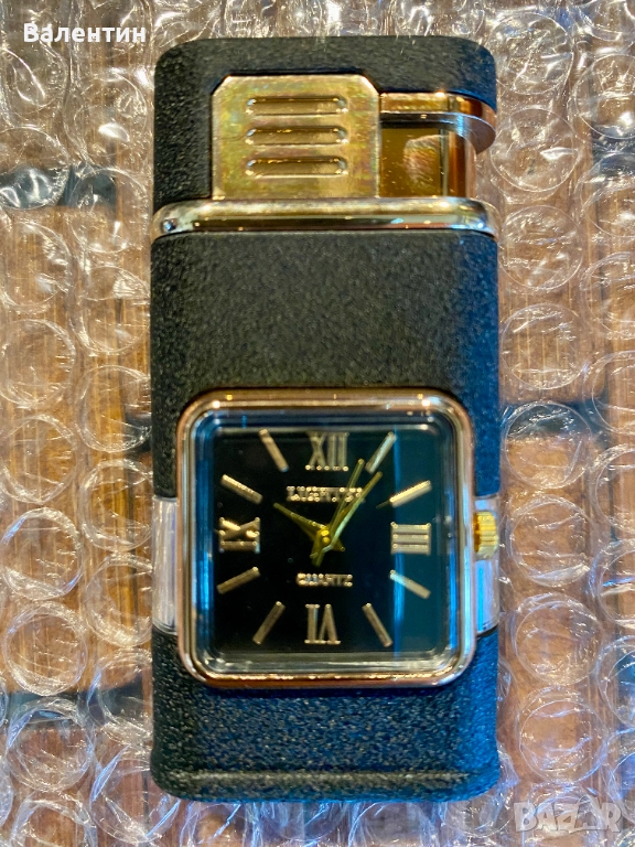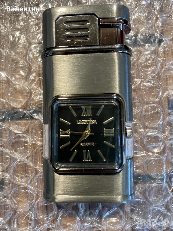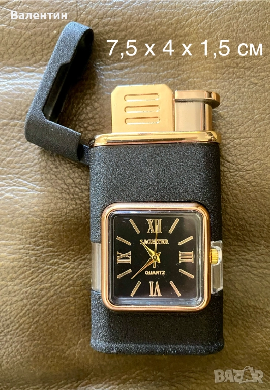 Газова ветроустойчива запалка с кварцов часовник, два вида пламък, регулиране на височината на пламъка, доста тежка за размера си, солидно изработена. Абсолютно нова. Прекрасен подарък или сувенир ! Размерите 7,5 х 4 х 1,5 см. Лесна смяна на батерията в часовник = 5 минути.Предлагаме и 5 резервни батерии за 5 лева.