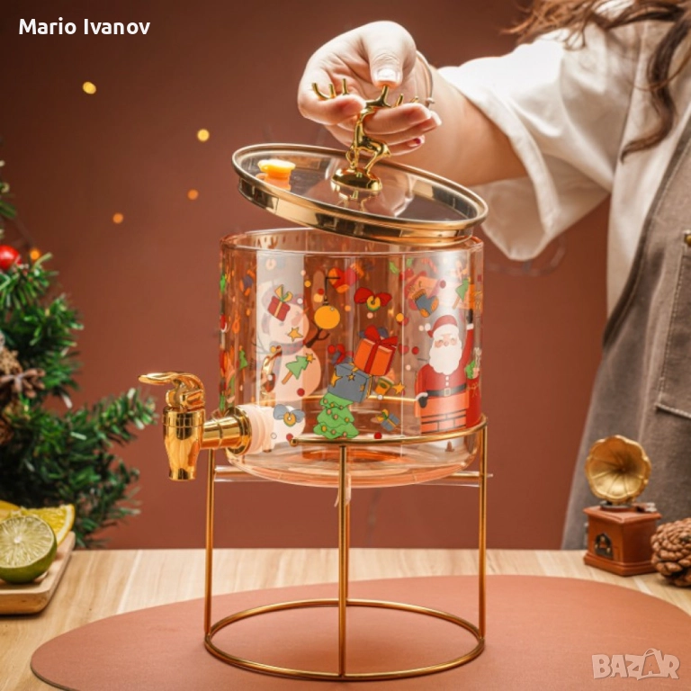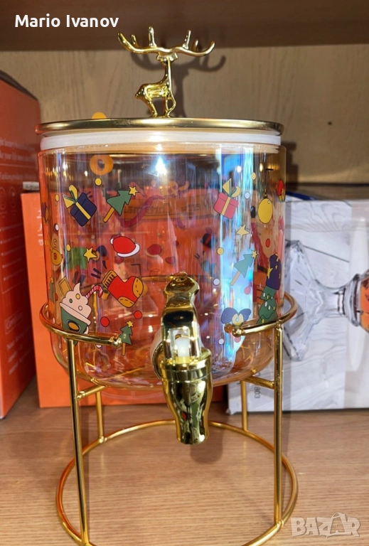 Стъклен диспенсър за напитки 2.6 L с коледен дизайн и златиста стойка → Обява 52847235