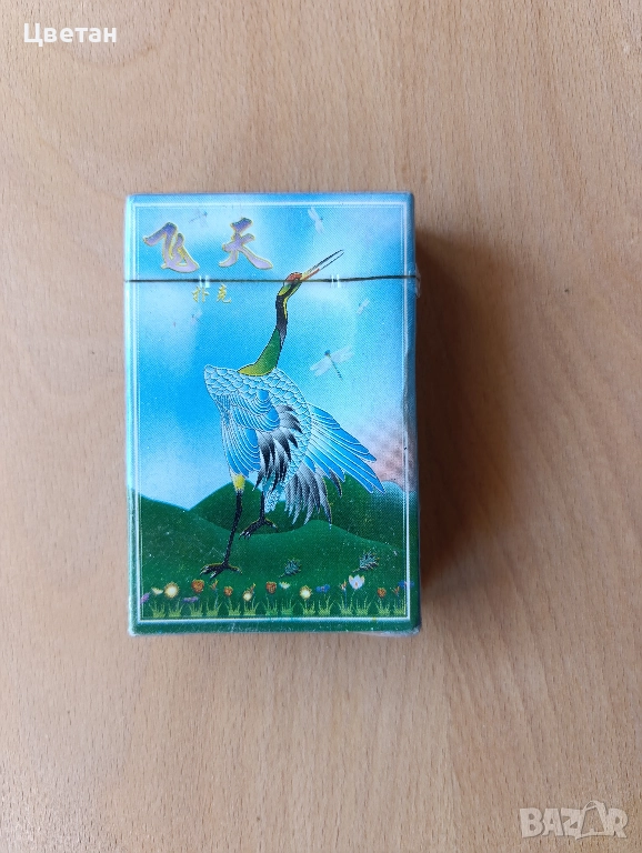 Кутията е украсена с изображение на птица, вероятно жерав, което лети над пейзаж, добавяйки естетическа стойност към продукта. Тези карти вероятно са предназначени за игра на покер или други игри с карти, а също така могат да бъдат колекционерски артикул поради дизайна си.