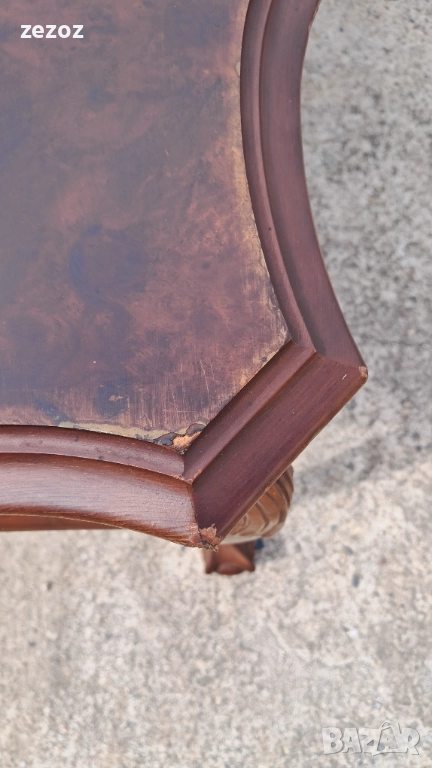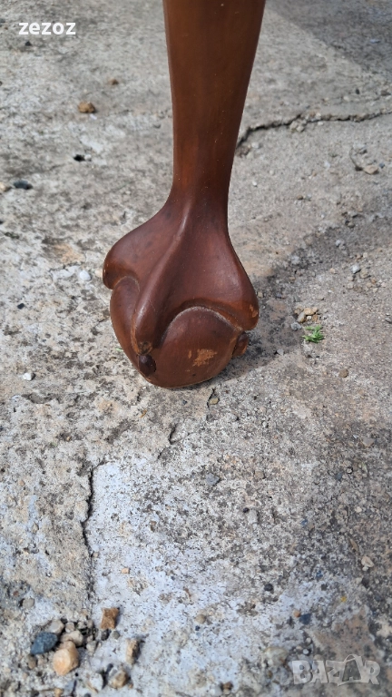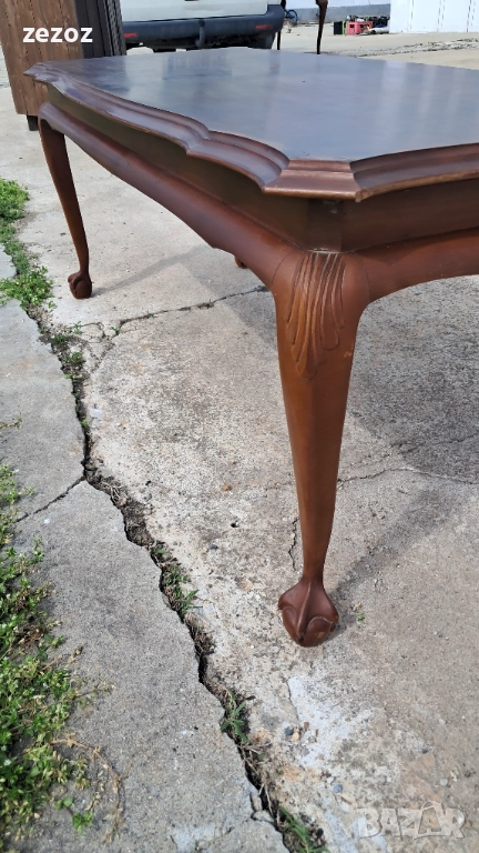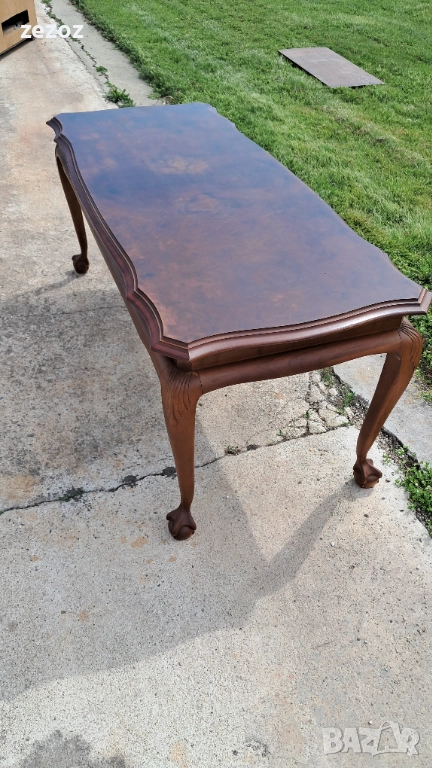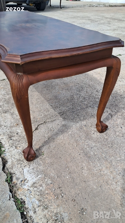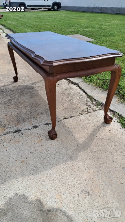 Ретро холна маса,изработена в стил"Чипъндейл".Масив.Характерните за стила,силно извити в горната част крака завършващи с птичи нокти върху топка.Поради възраста си по плота на масата има драскотини и забележки.Видими на снимките.Като цяло масата е добре запазена за годините си.Конструктивно здрава.Размери-