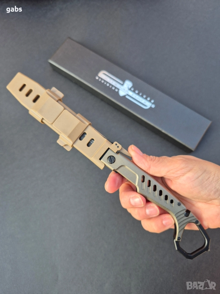 Дръжката му, изработена от анодизиран антикорозивен алуминий в цвят Tactical Mud, включва заден пръстен за сигурно захващане, чупещо стъкло от волфрамов карбид и нож за предпазен колан с острие тип резачка.