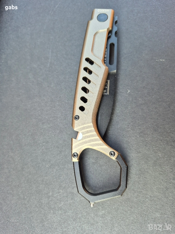 Оборудван с острие от стомана Böhler N690 с черно покритие, той разполага с назъбена секция близо до основата за бързо рязане на твърди материали.
