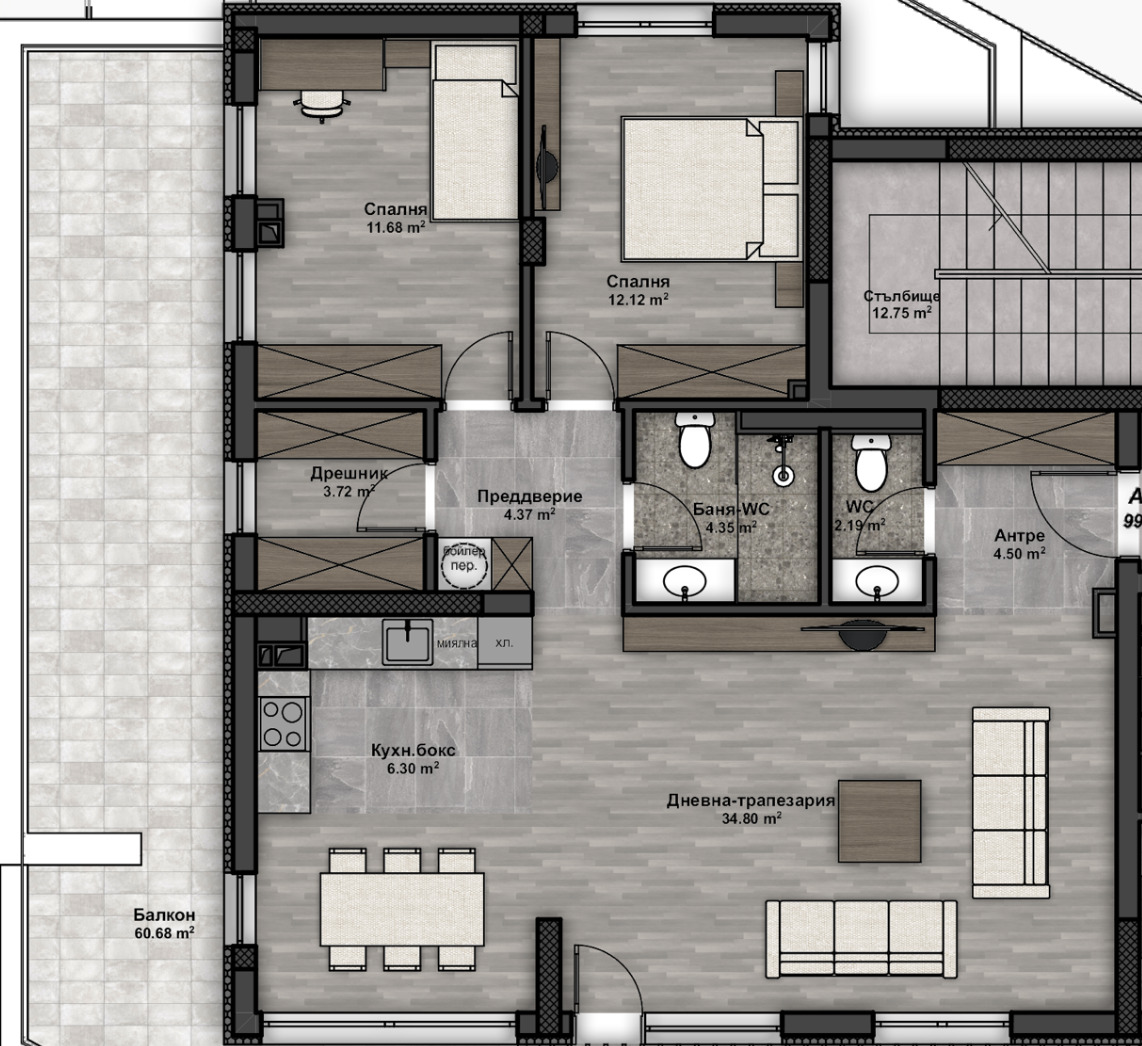 - Две самостоятелни спални, подходящи както за семейство, така и за кабинет или детска стая.