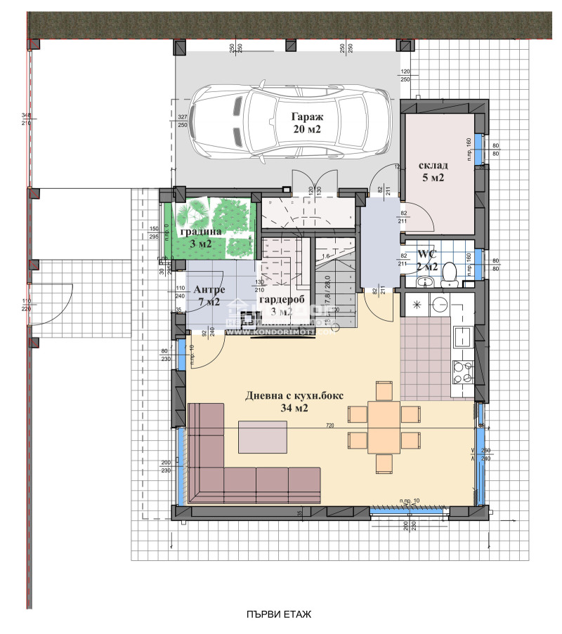 На първото ниво са разположени просторна дневна с кухненска зона, елегантна зимна градина, складово помещение и тоалетна. Второто ниво предлага две уютни спални, мастър спалня с гардеробна и самостоятелна баня, както и допълнителна баня, обслужваща етажа.