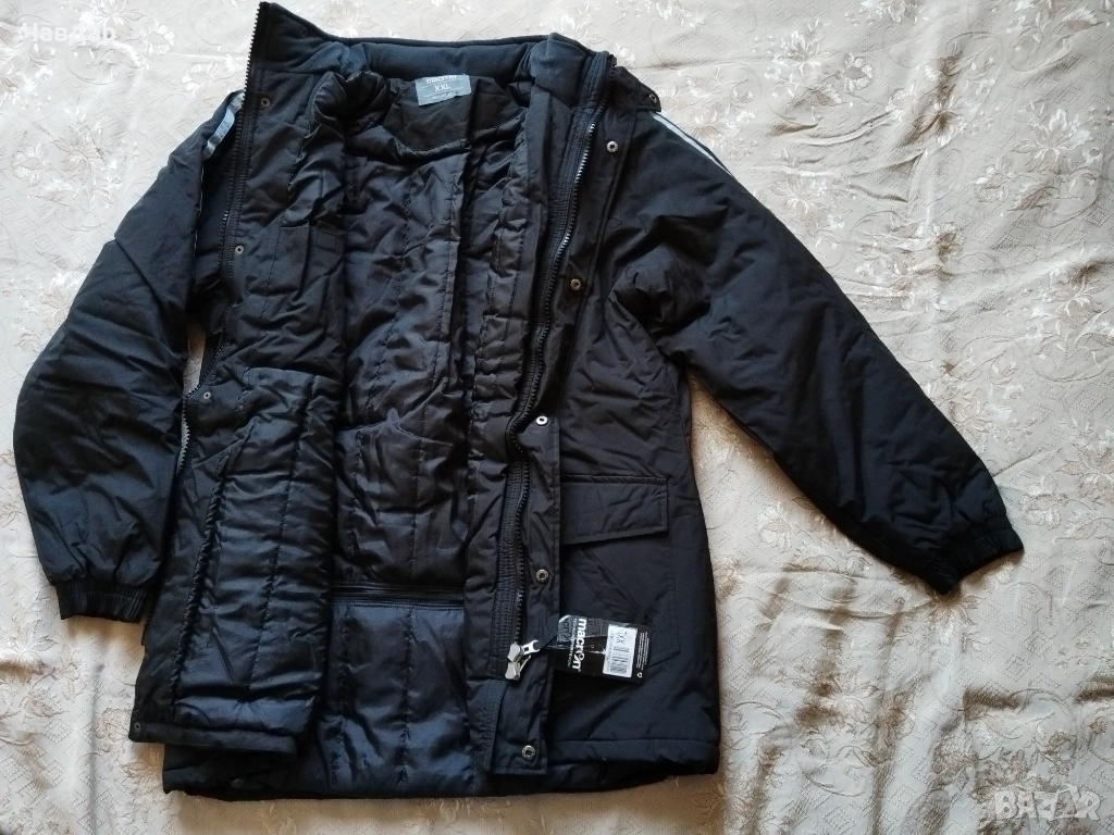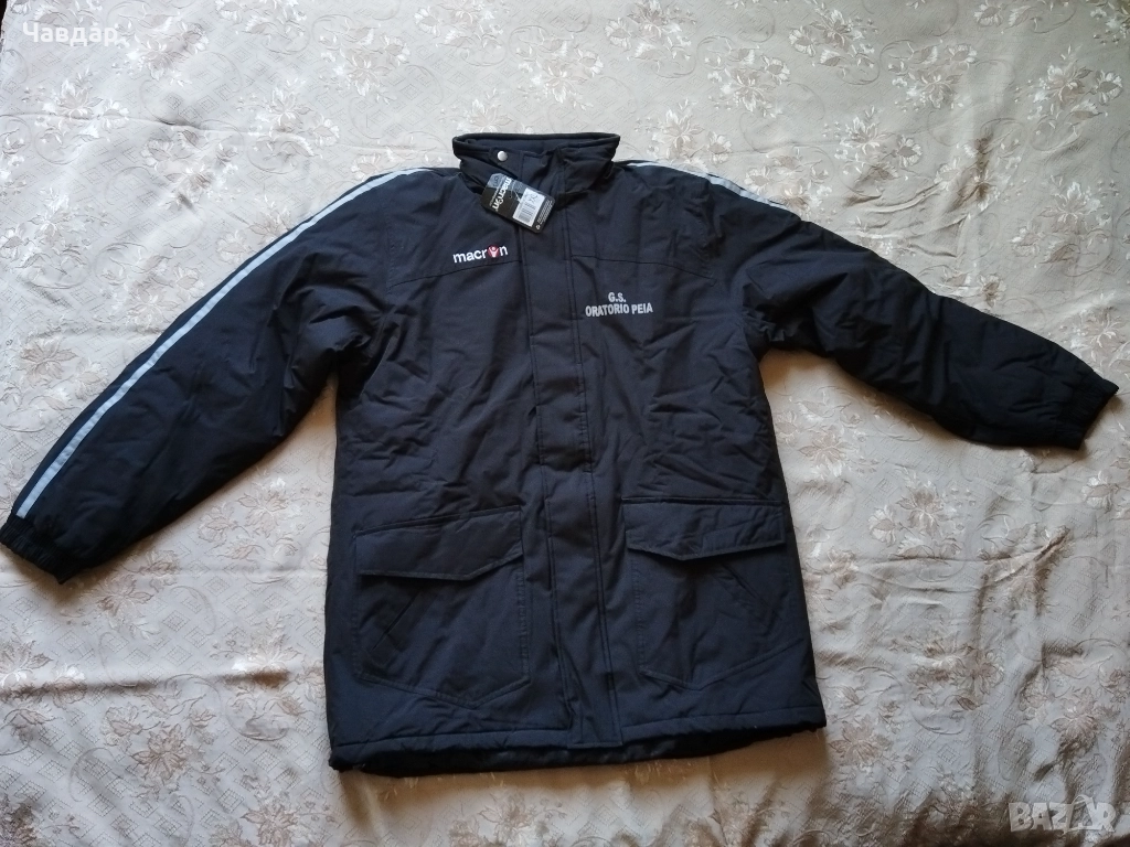Мъжко зимно яке MACRON - размер XXL. Цвят - черен. Материя - 100% полиестер. 4 външни джоба. Закопчаване - двойно действащ цип и тик-так копчета. Качулка прибираща се в яката. Размери: рамо - 52 см., подмишници - 70 см., височина (гръб - до яката) - 90 см., ръкав външно - 70 см., ръкав вътр. - 56 см. Състояние - НОВО с ЕТИКЕТ. Цена - 45 евро.